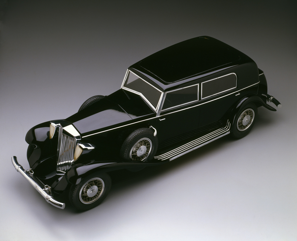This is a automobile model. It was designed by Walter Dorwin Teague and Walter Dorwin Teague, Jr. and fabricated by Boucher and made for (as the client) Marmon Motor Car Company. It is dated 1930 and we acquired it in 1977. Its medium is lacquered wood, chrome-plated metal, rubber. It is a part of the Product Design and Decorative Arts department.