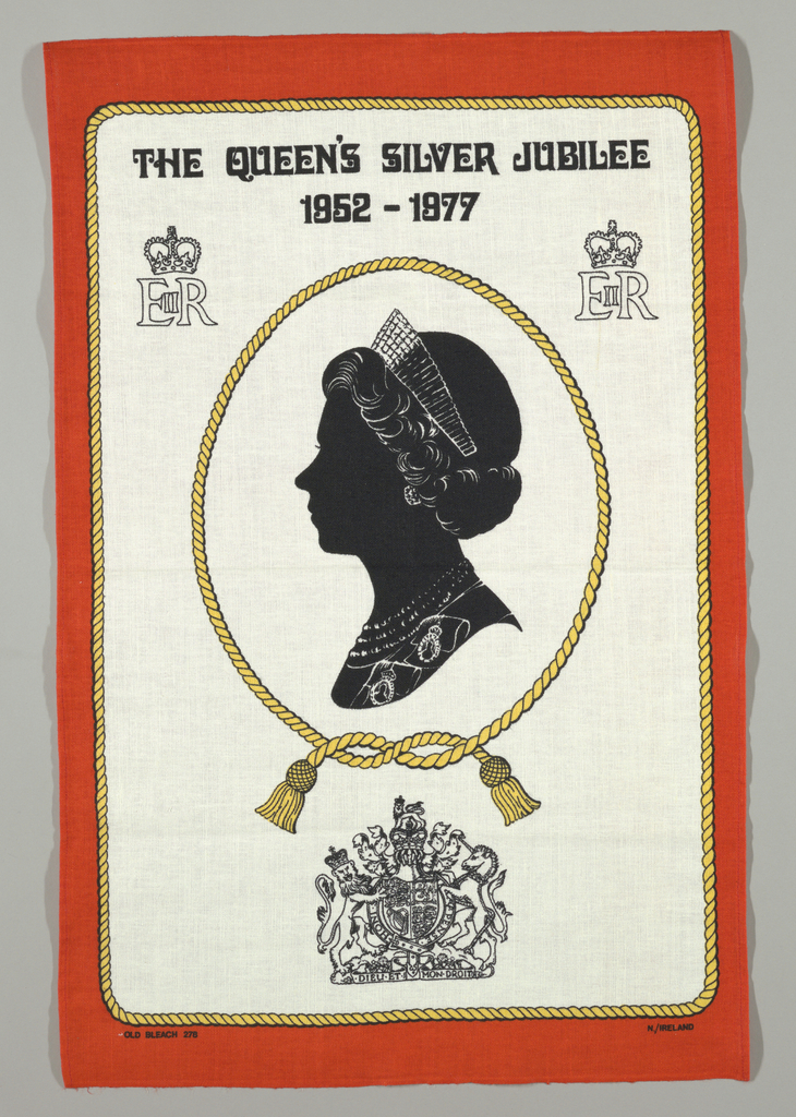 Commemorative Tea Towel, The Queen's Silver Jubilee 1952–1977; Manufactured by Old Bleach Linen Company, Ltd.; 52% linen, 48% cotton; H x W: 74.6 × 48.7 cm (29 3/8 × 19 3/16 in.); Gift of Susanna Ebendorf; 1977-75-2