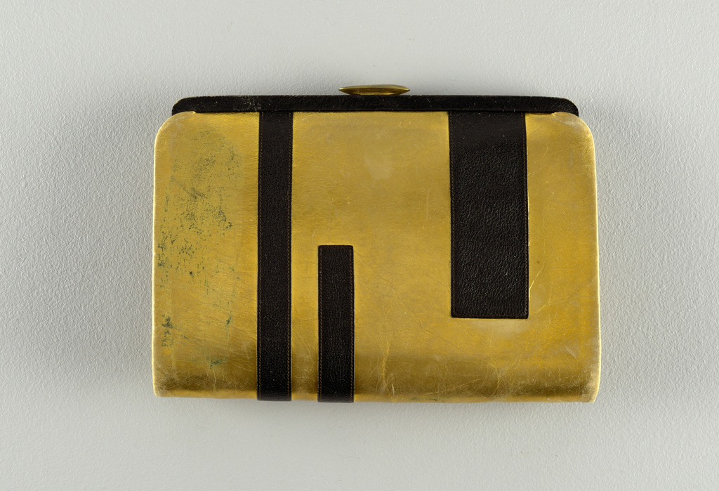 This is a Purse. It is dated ca. 1915–20 and we acquired it in 1978. Its medium is gilded calfskin leather with overlaid stitched pigskin strips; cast gilt metal snap; moirre textile (interior). It is a part of the Product Design and Decorative Arts department.