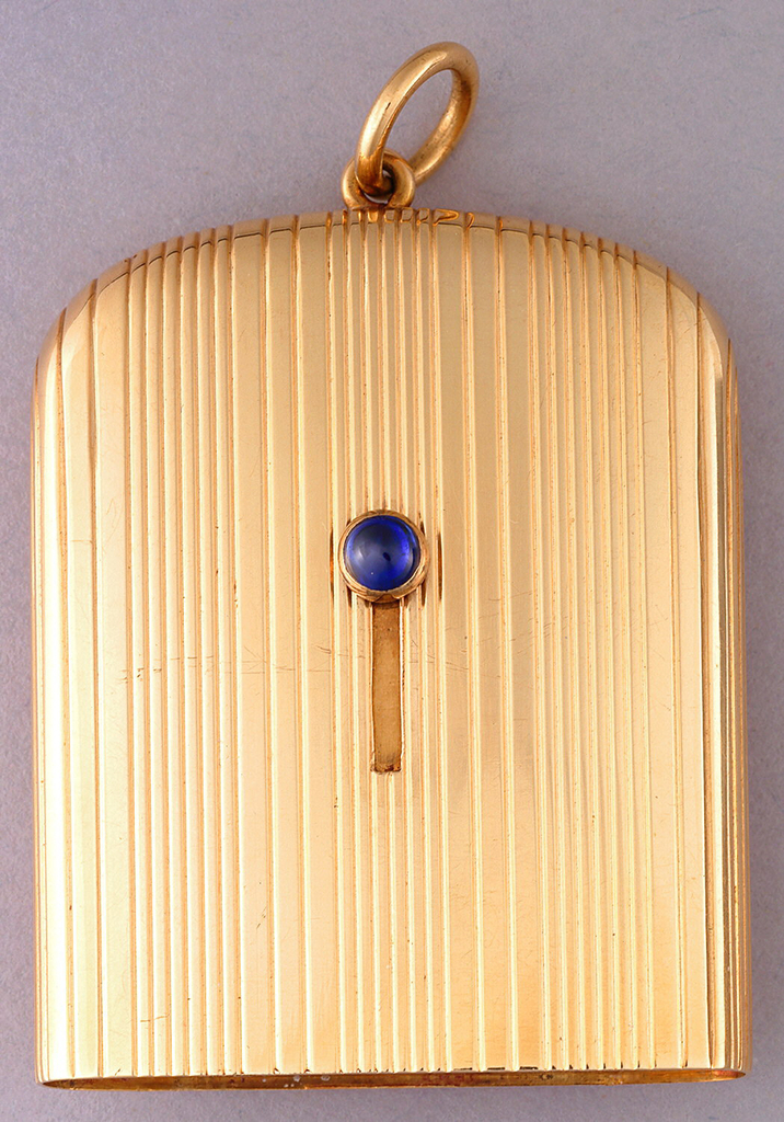 This is a Matchsafe. It was made by Cartier. It is dated ca. 1920 and we acquired it in 1978. Its medium is gold, sapphire. It is a part of the Product Design and Decorative Arts department.