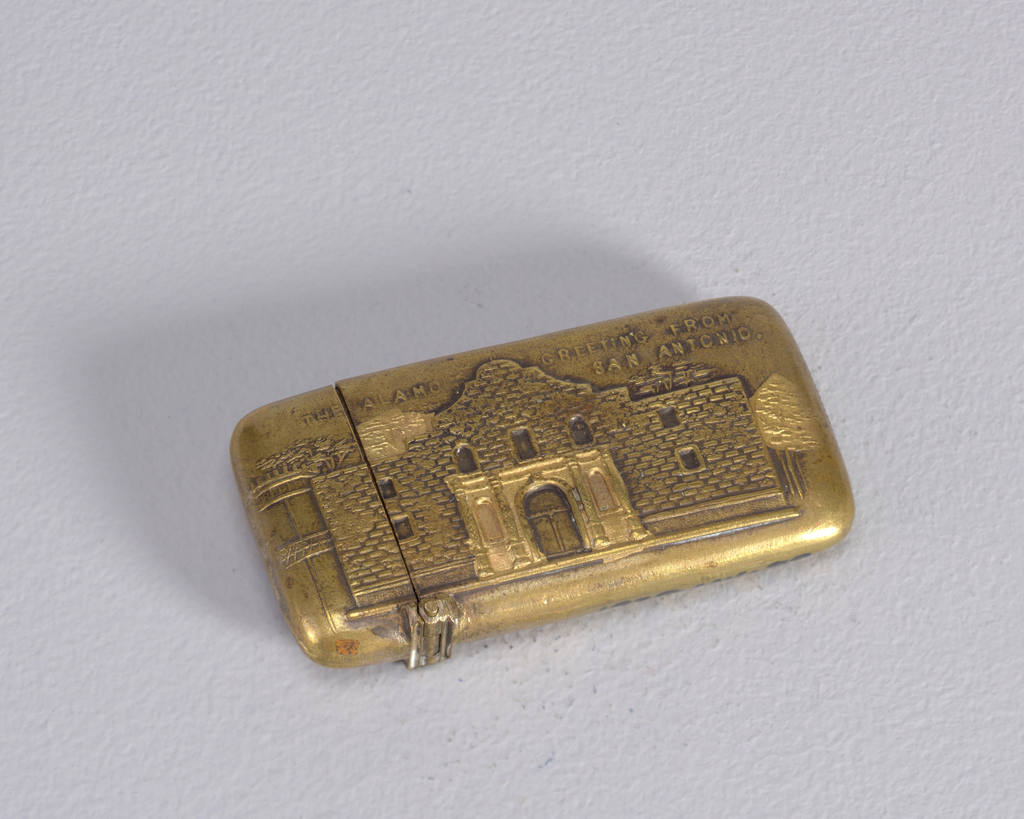 "The Alamo, San Antonio, Texas" Matchsafe; probably USA; brass; 2.9 x 5.4 x .7 cm (1 1/8 x 2 1/8 x 1/4 in. ); Gift of Stephen W. Brener and Carol B. Brener; 1978-146-89