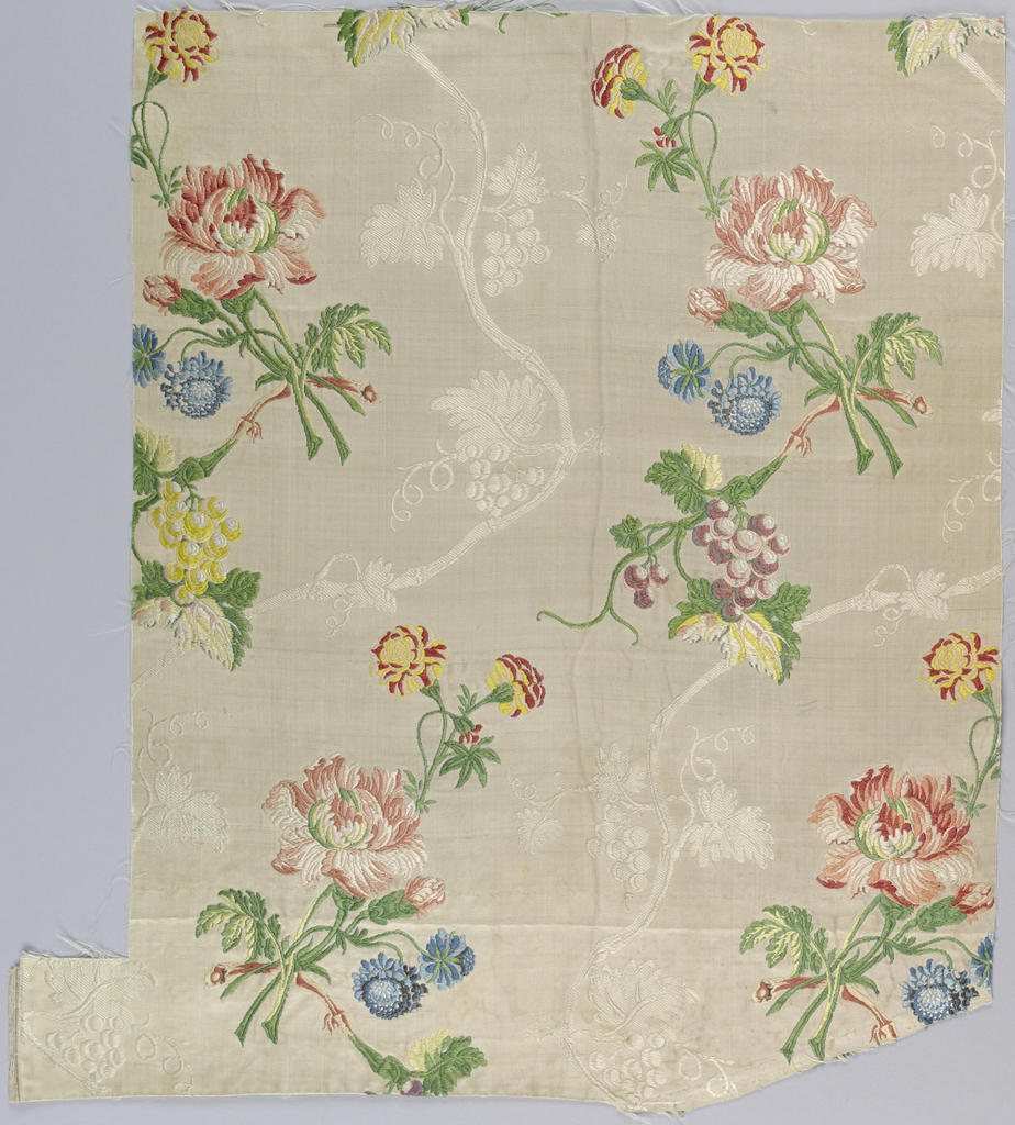 This is a Textile. It is dated early 18th–late 18th century and we acquired it in 1978. Its medium is silk and its technique is plain weave with discontinuous supplementary warp patterning (brocade). It is a part of the Textiles department.