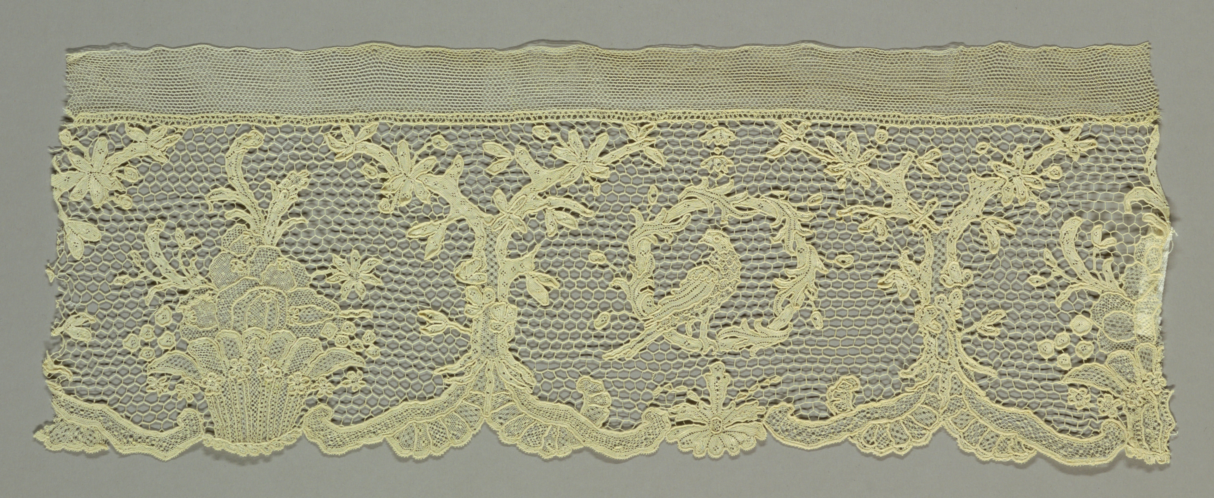 This is a Fragment. It is dated 18th century and we acquired it in 1978. Its medium is linen and its technique is needle lace with 6-sided reworked ground. It is a part of the Textiles department.