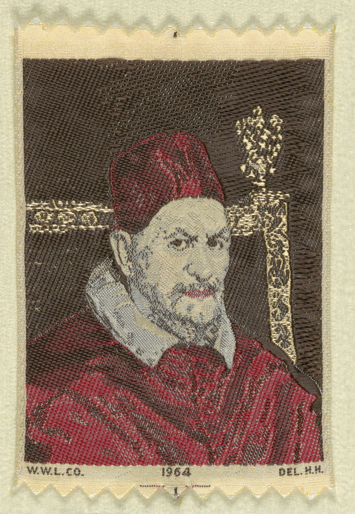 In 1978, Cooper Hewitt received a gift of twenty-two jacquard woven souvenir portrait ribbons from Lisa Taylor, the museum’s director at the time. The series was produced by the Warner Woven Label Company, Inc. of Paterson, New Jersey, which every year made a single souvenir ribbon based on a famous master portrait painting in Western art. The series likely started in the 1950s for an intended audience of Warner clients. The ribbon for 1964 was Portrait of Pope Innocent X (1650) by Diego Velázquez (Spanish, 1599-1660). The initials "H.H." in the lower-right corner stand for Howard Huffsschmidt, one of Warner’s textile designers. Undoubtedly, the series gave the label and ribbon manufacturer an opportunity to demonstrate its technical prowess by producing a highly-detailed woven portrait in a small format – a rectangle approximately three by four inches. The Warner Woven Label Company changed its name to Warner-Artex, Inc. in the late 1970s.