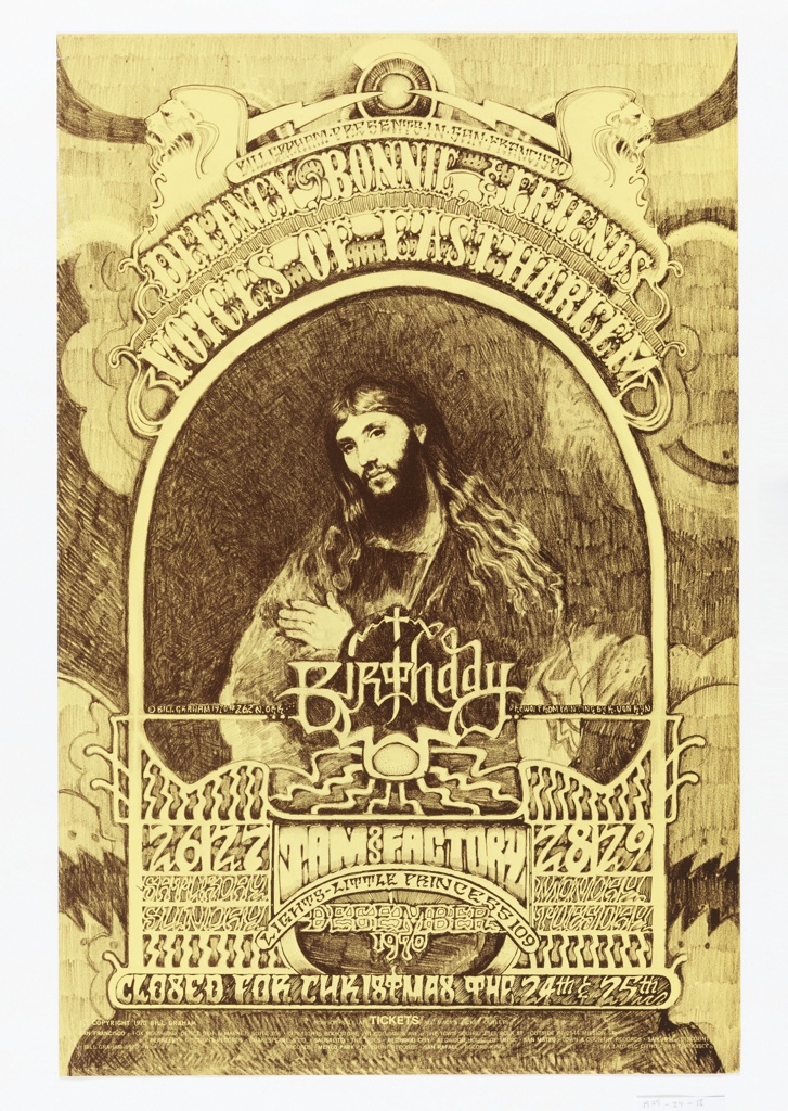 Posters produced in the 1970s for The Fillmore, the San Francisco music venue made famous by Bill Graham, were renowned for their psychedelic styling. Graham commissioned local artists to design the posters, which were printed regularly for a constantly changing roster of weekly performances. The hand-drawn style of this lithographic poster, designed for a holiday concert series in December 1970, is characteristic of the work of designer Norman Orr, who drew the central image after Rembrandt van Rijn’s 1657 painting Christ with Arms Folded.