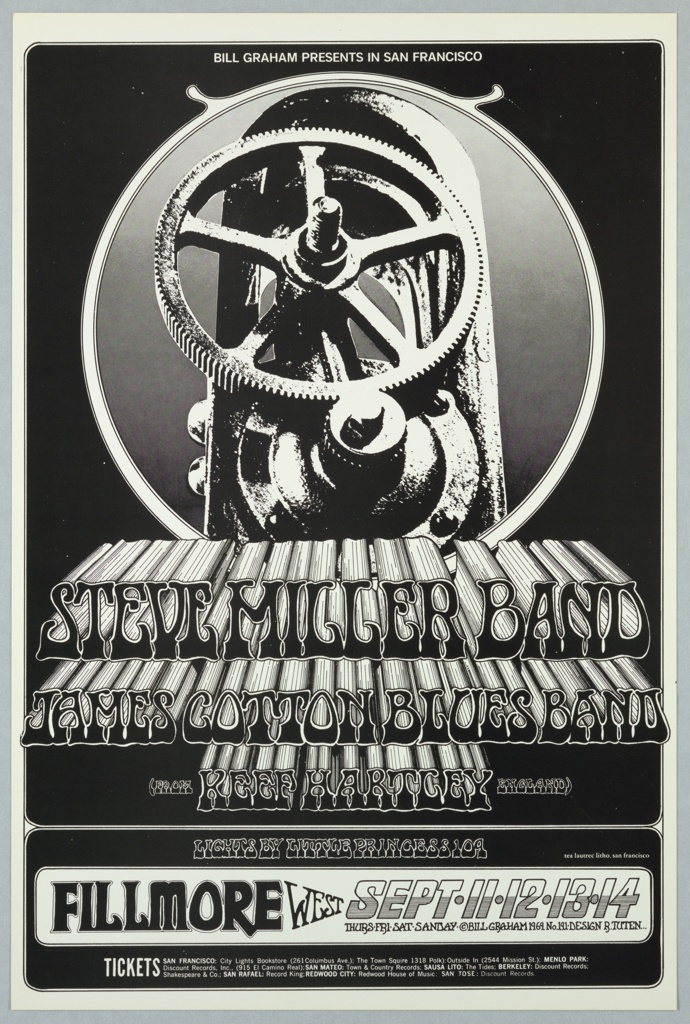 Poster, Steve Miller Band; Designed by R. Tuten; Printed by Tea Lautrec Litho (United States); offset lithograph on white wove paper; 53.5 x 35.7 cm (21 1/16 x 14 1/16 in.); Gift of Mr. and Mrs. Leslie J. Schreyer; 1979-34-23
