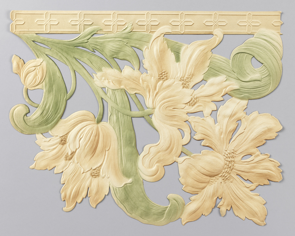 This is a Border. It is dated ca. 1905 and we acquired it in 1979. Its medium is embossed, die cut, air brushed, paper. It is a part of the Wallcoverings department.