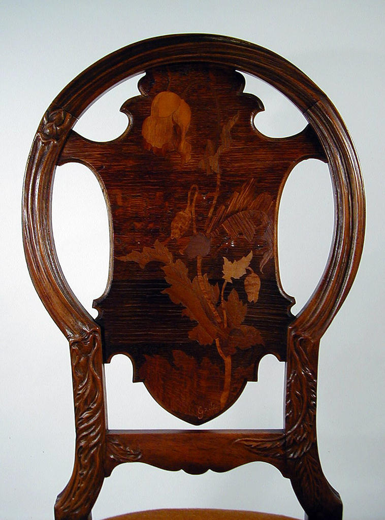 This is a side chair. It was designed by Emile Gallé and manufactured by Etablissement Gallé and retailed by Marshall Field and Co.. It is dated ca. 1900 and we acquired it in 1979. Its medium is pearwood, various woods (marquetry), upholstery (replaced). It is a part of the Product Design and Decorative Arts department.