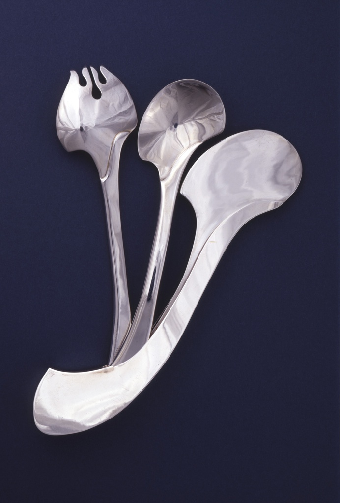 Graham designed this silver flatware set, which is composed of a fork, spoon, and knife. While the set was designed in 1978, its aesthetic, characterized by its curvaceous forms and smooth surfaces, is reminiscent of the Art Nouveau style of the early 20th century. The grouping comes with a unique feature: all three pieces of cutlery interlock to facilitate portability: there are slots in the knife handle that hold both the fork and spoon, and the curved fork tines and spoon bowl fit neatly on either side of the knife blade.