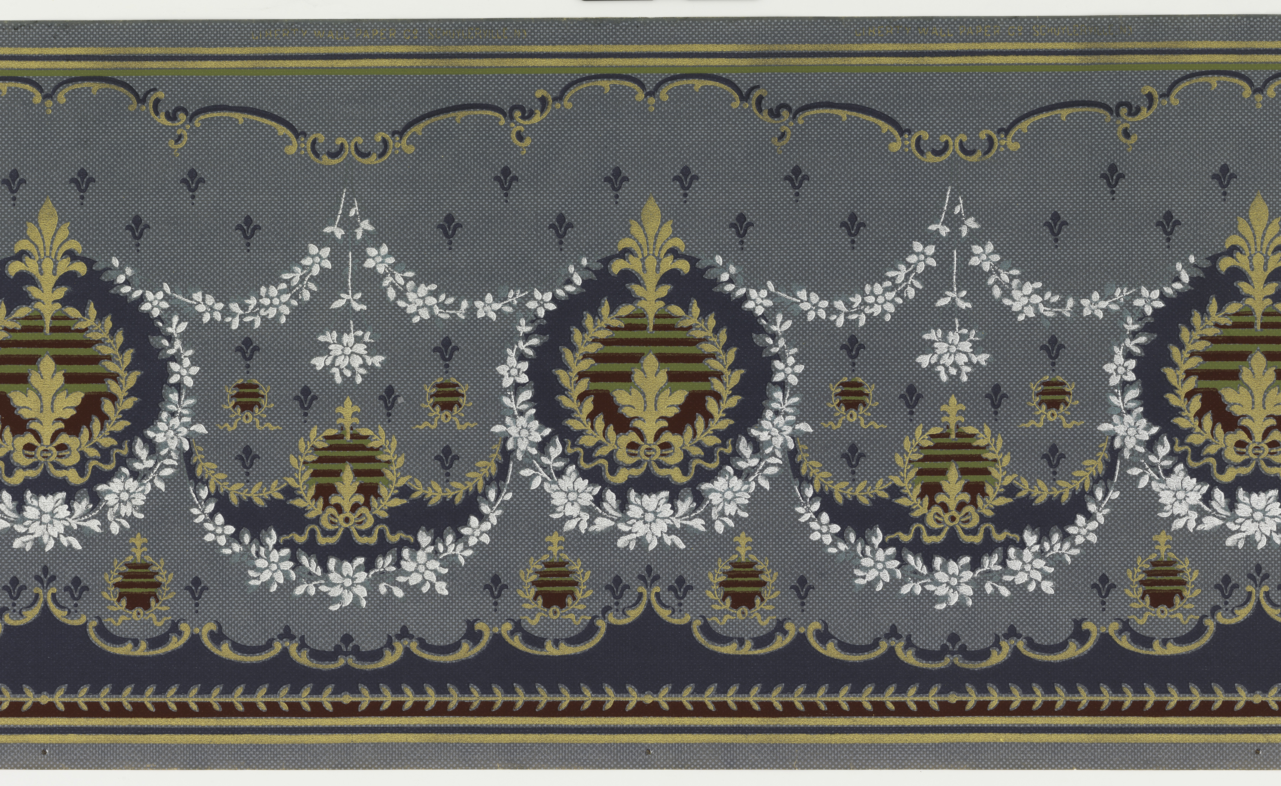 This is a frieze. It was manufactured by Liberty Wall Paper Company. It is dated 1905–1915 and we acquired it in 1979. Its medium is machine-printed paper. It is a part of the Wallcoverings department.