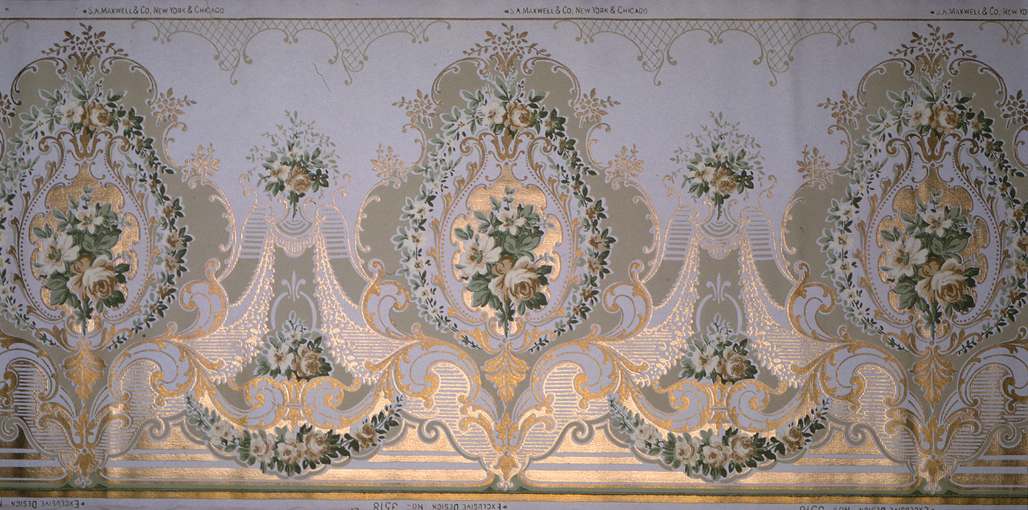 This is a frieze. It was distributed by Maxwell & Co., S.A.. It is dated 1905–1915 and we acquired it in 1979. Its medium is machine-printed paper, ribbed ground. It is a part of the Wallcoverings department.