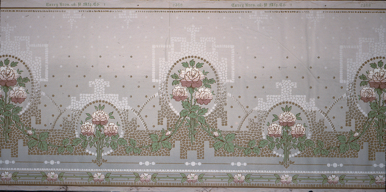 This is a frieze. It was manufactured by Carey Bros. W.P. Mfg. Co.. It is dated 1905–1915 and we acquired it in 1979. Its medium is machine-printed paper. It is a part of the Wallcoverings department.