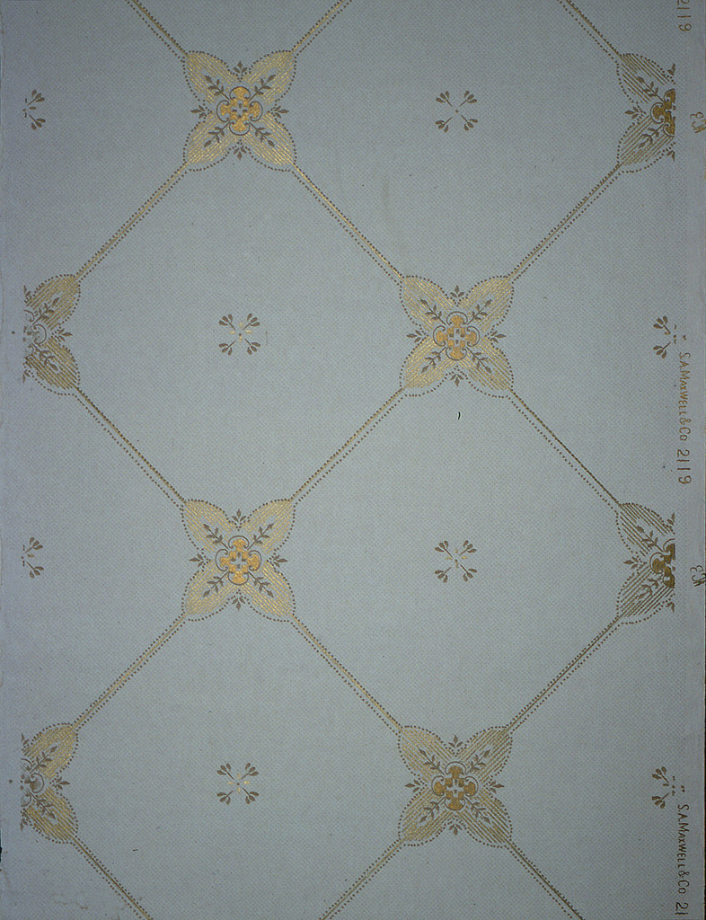 This is a Ceiling paper. It was manufactured by Maxwell & Co., S.A.. It is dated 1905–1915 and we acquired it in 1979. Its medium is machine-printed paper, liquid mica. It is a part of the Wallcoverings department.
