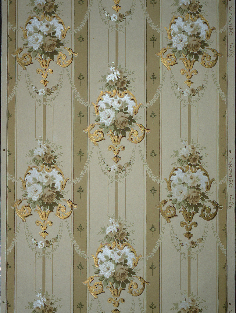 This is a Sidewall. It was manufactured by Cresswell & Washburn Ltd. It is dated 1905–1915 and we acquired it in 1979. Its medium is machine-printed paper, liquid mica. It is a part of the Wallcoverings department.