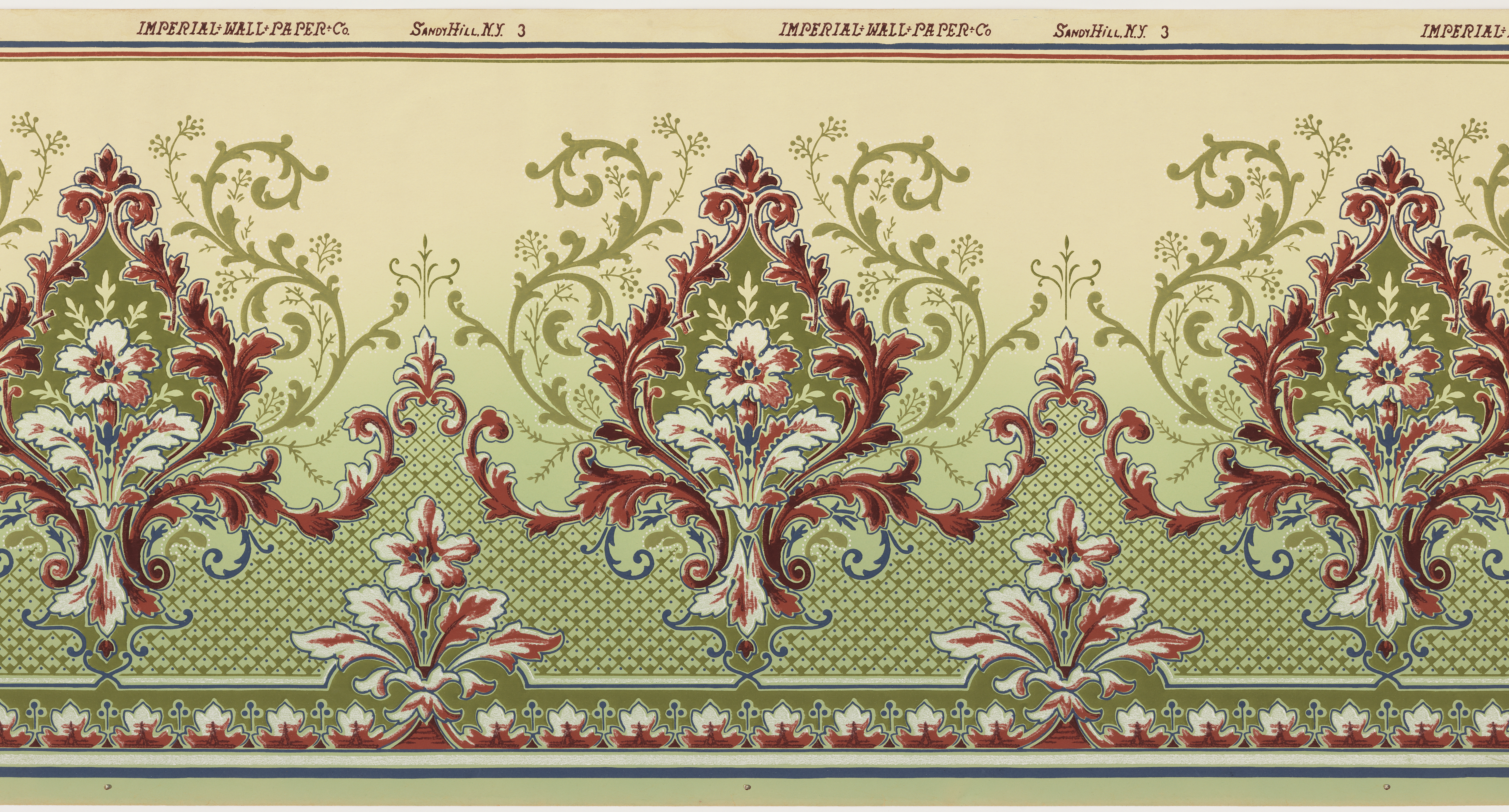 This is a frieze. It was manufactured by Imperial Wallcoverings Inc.. It is dated 1905–1915 and we acquired it in 1979. Its medium is machine-printed paper, liquid mica. It is a part of the Wallcoverings department.