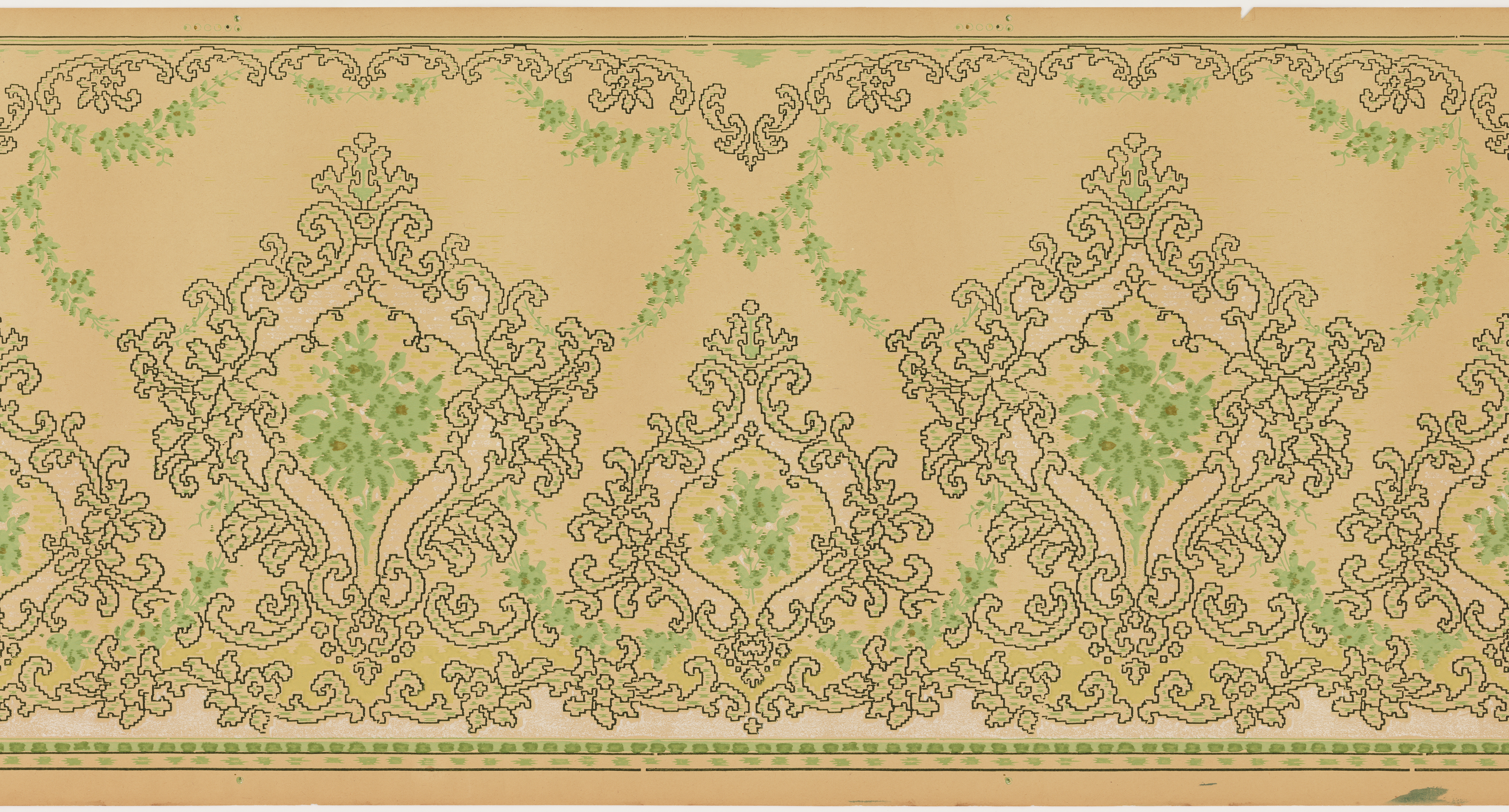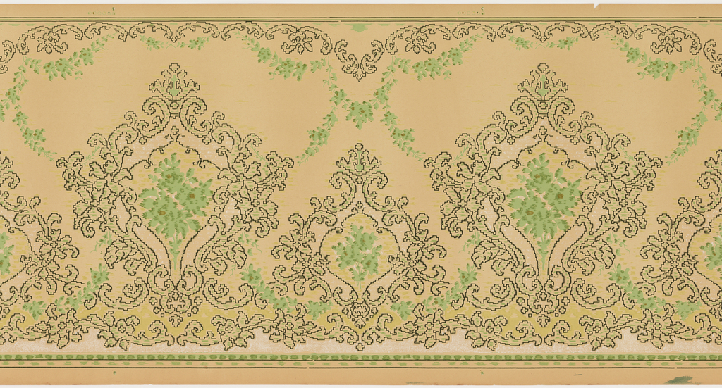 This is a frieze. It is dated 1905–1915 and we acquired it in 1979. Its medium is machine-printed paper, ungrounded, liquid mica. It is a part of the Wallcoverings department.