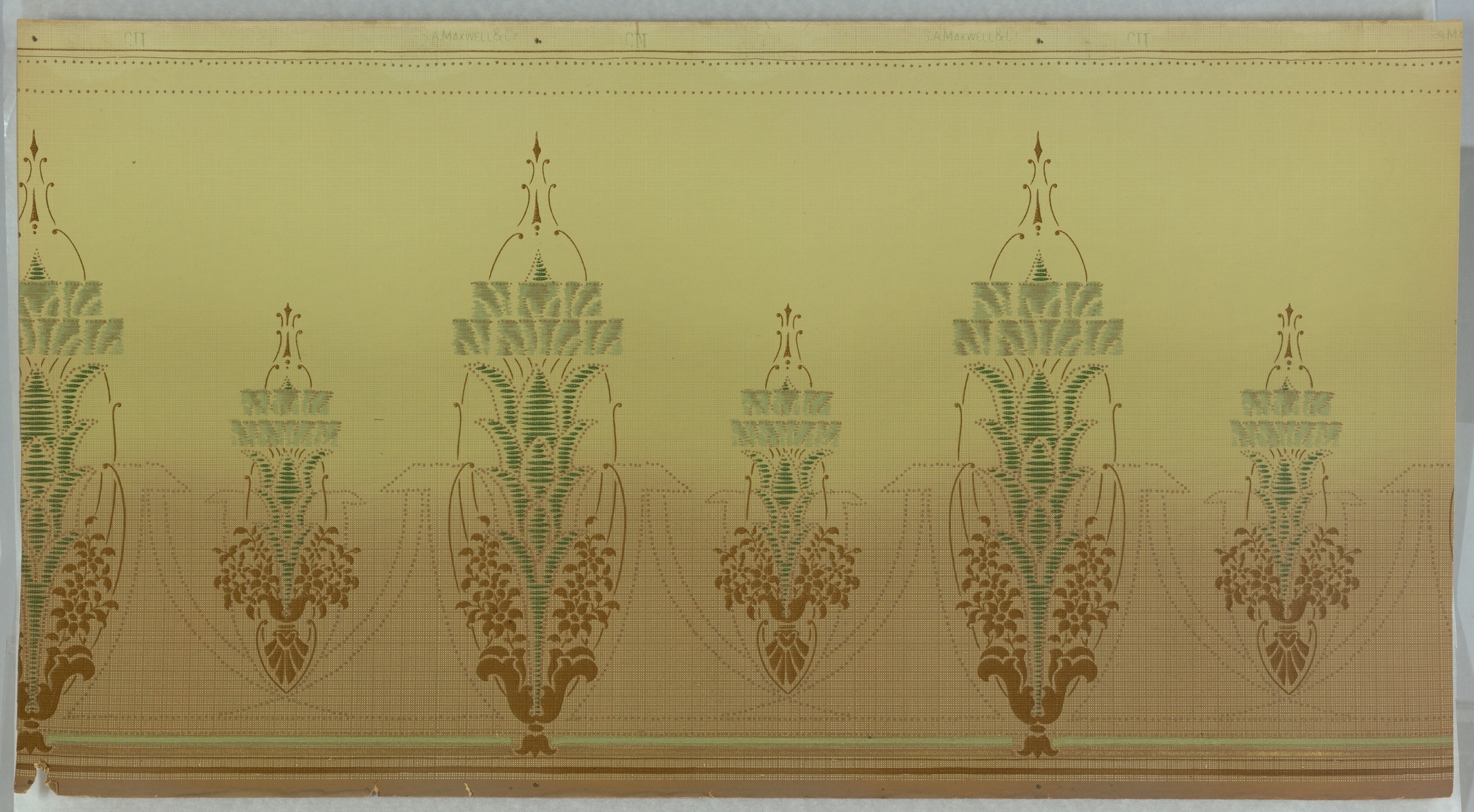 This is a frieze. It was manufactured by S.A. Maxwell & Co.. It is dated 1905–1915 and we acquired it in 1979. Its medium is machine-printed paper. It is a part of the Wallcoverings department.