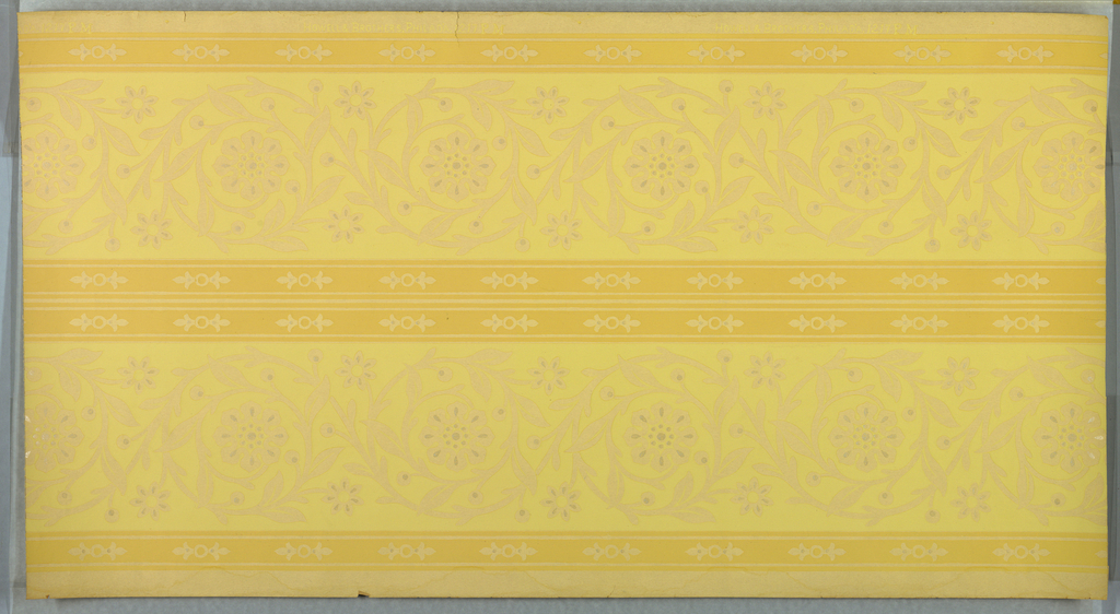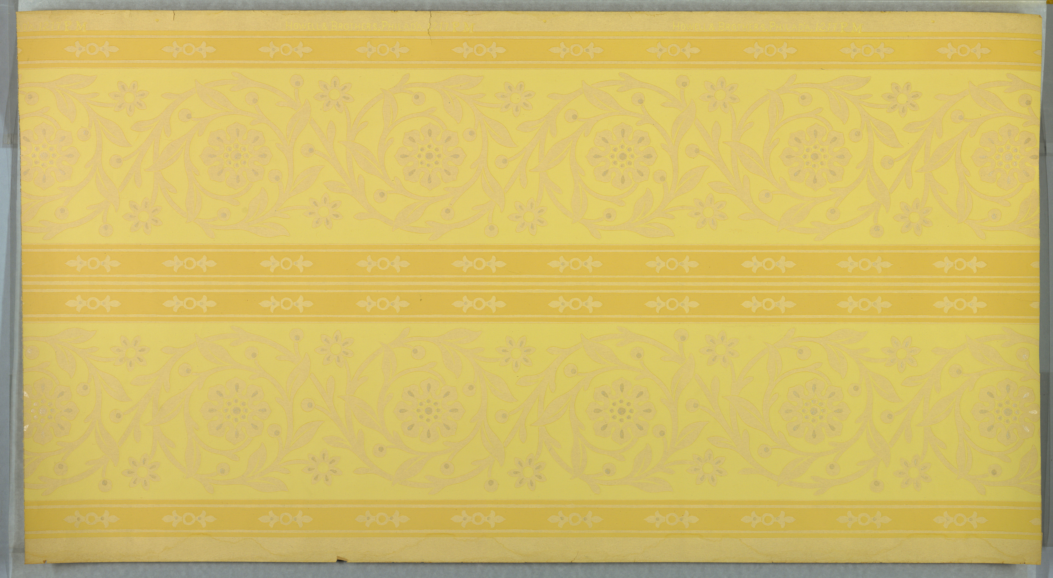 This is a frieze. It was manufactured by Howell and Brothers. It is dated 1905–1915 and we acquired it in 1979. Its medium is machine-printed paper, liquid mica. It is a part of the Wallcoverings department.