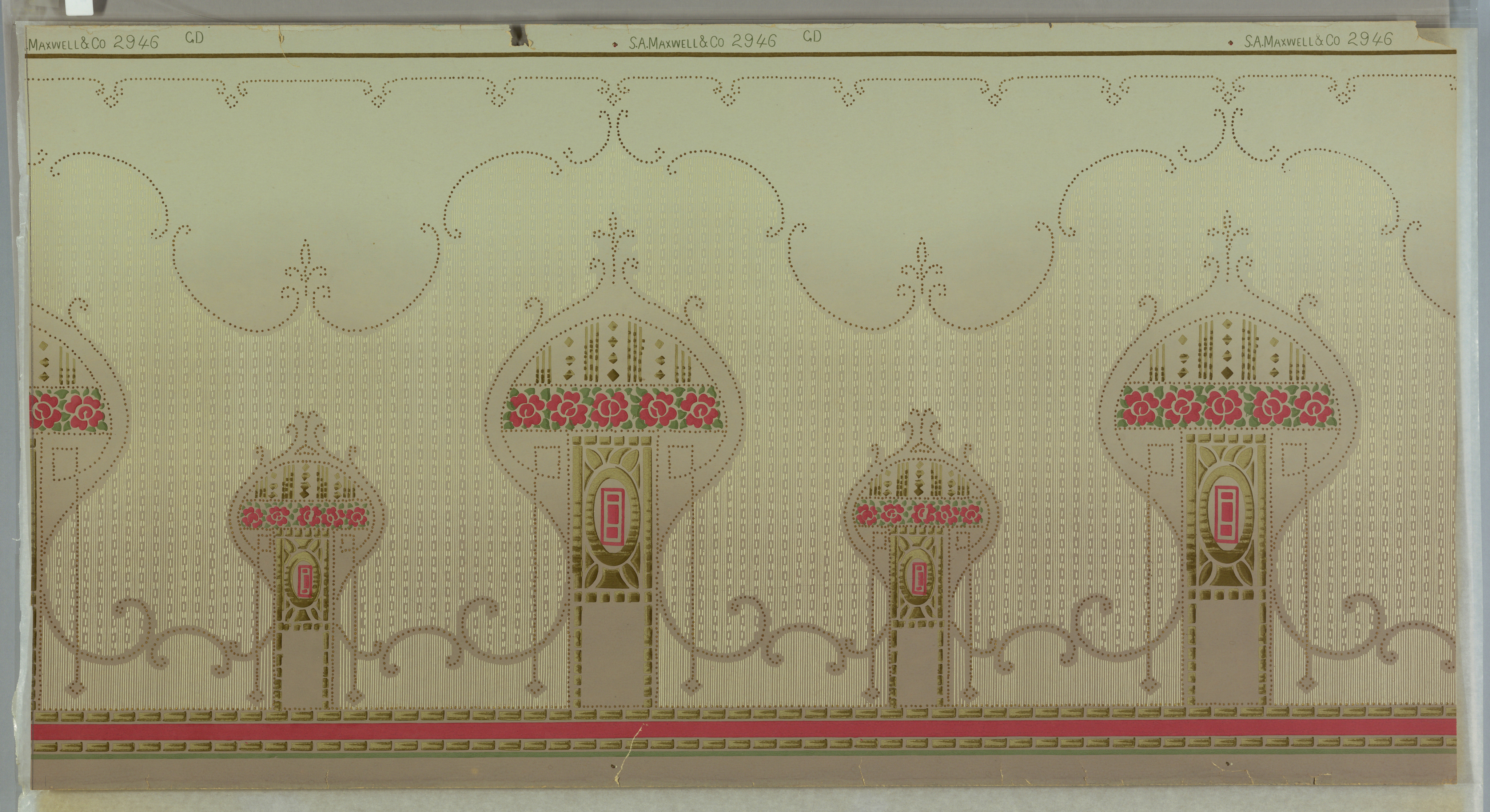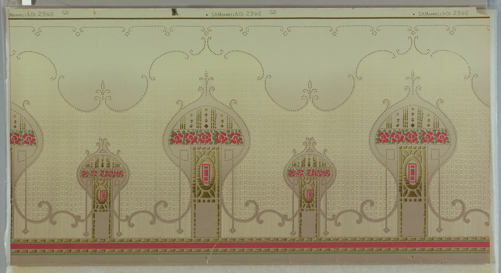 This is a frieze. It was manufactured by S.A. Maxwell & Co.. It is dated 1905–1915 and we acquired it in 1979. Its medium is machine-printed paper. It is a part of the Wallcoverings department.