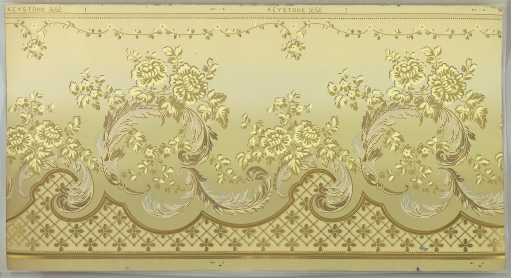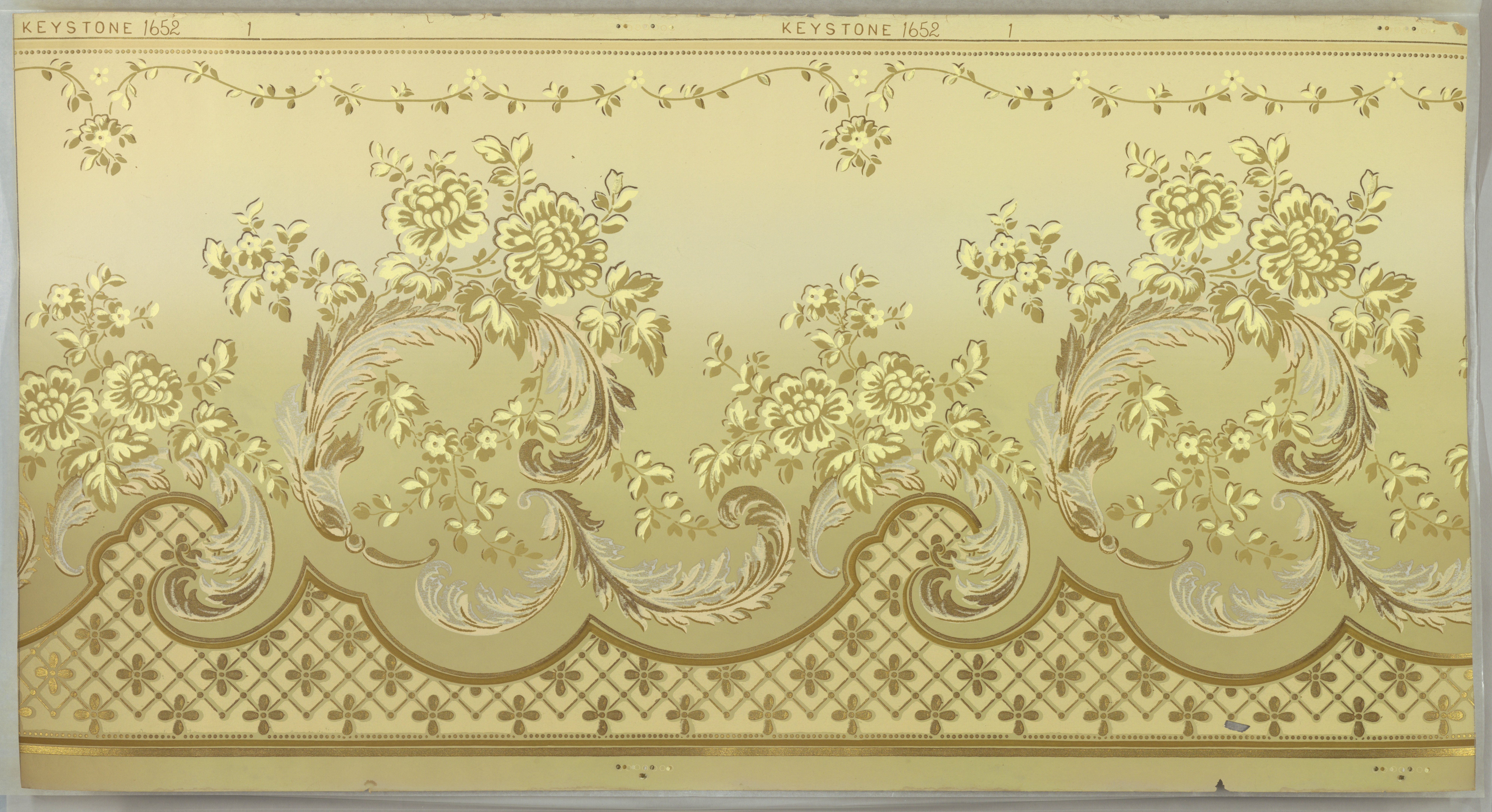 This is a frieze. It was manufactured by Keystone Wall-Paper Company. It is dated 1905–1915 and we acquired it in 1979. Its medium is machine-printed paper, liquid mica. It is a part of the Wallcoverings department.