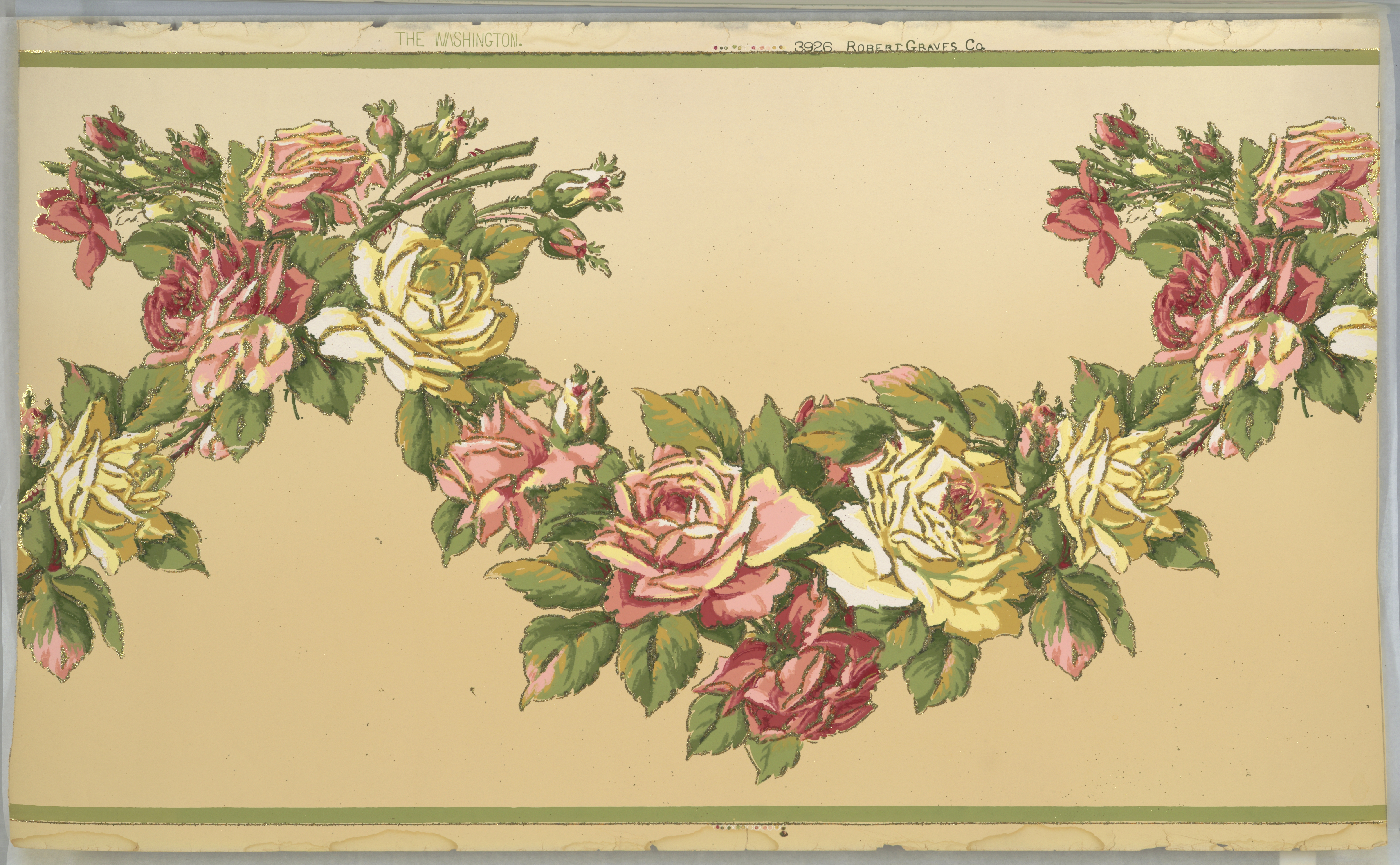 This is a frieze. It was manufactured by Robert Graves Co.. It is dated 1905–1915 and we acquired it in 1979. Its medium is machine-printed paper, mica flakes. It is a part of the Wallcoverings department.