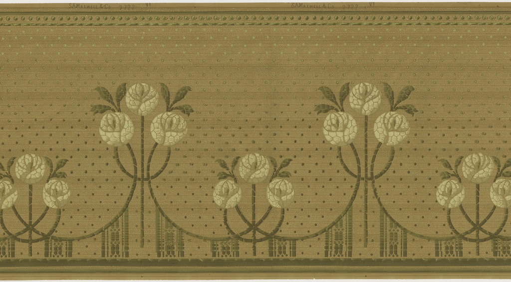 This is a frieze. It was distributed by Maxwell & Co., S.A.. It is dated 1905–1915 and we acquired it in 1979. Its medium is machine-printed paper. It is a part of the Wallcoverings department.
