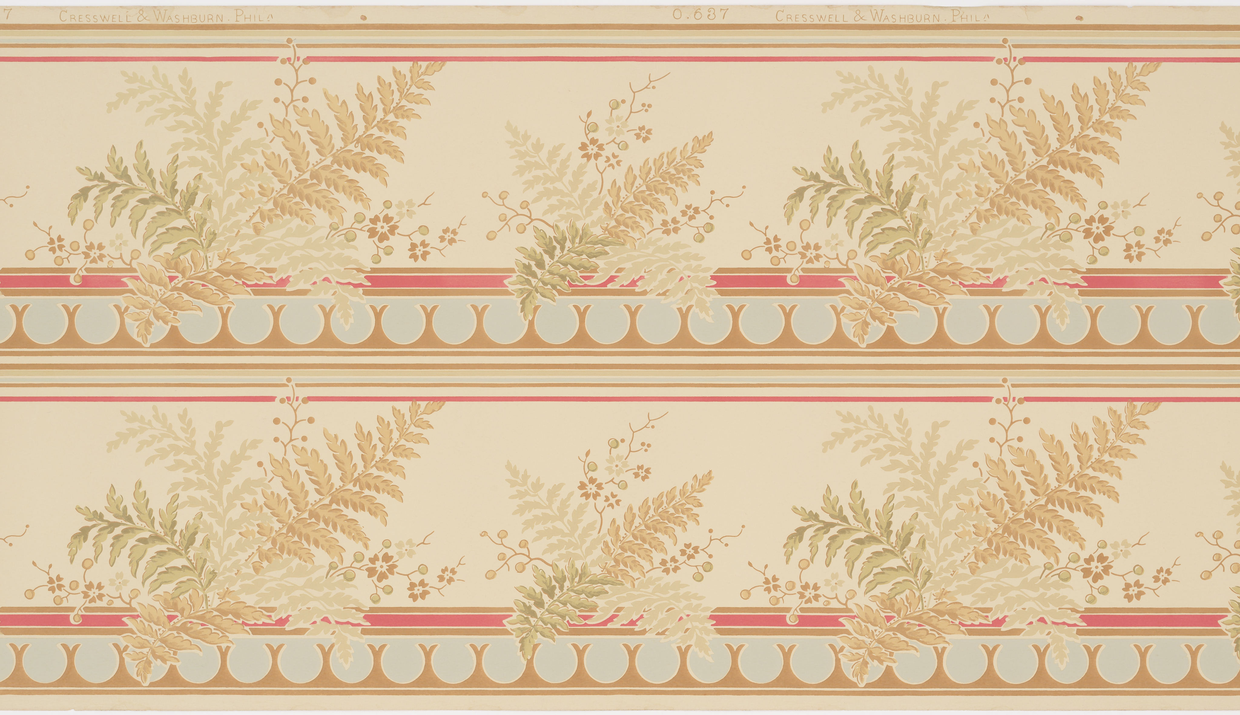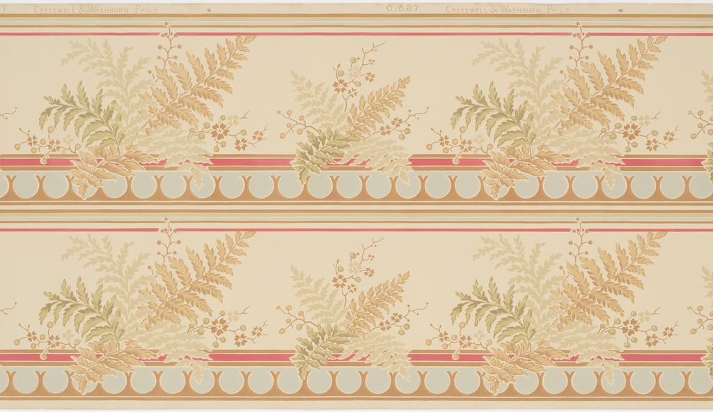 This is a frieze. It was manufactured by Cresswell & Washburn Ltd. It is dated 1905–1915 and we acquired it in 1979. Its medium is machine-printed paper. It is a part of the Wallcoverings department.