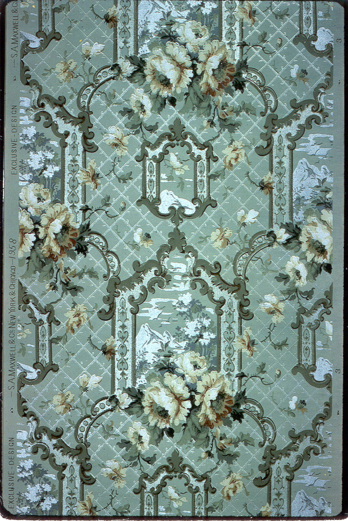 This wallpaper was part of a matched set of sidewall, border and ceiling paper. Matched sets were available by 1898 and simplified the buying process for consumers, who then only had to select a color and style. They no longer had to sort through endless samples of wallpapers, borders and ceiling papers to find one of each to match. While each of the different papers could be purchased separately buying them as a set guaranteed a uniform and cohesive look.