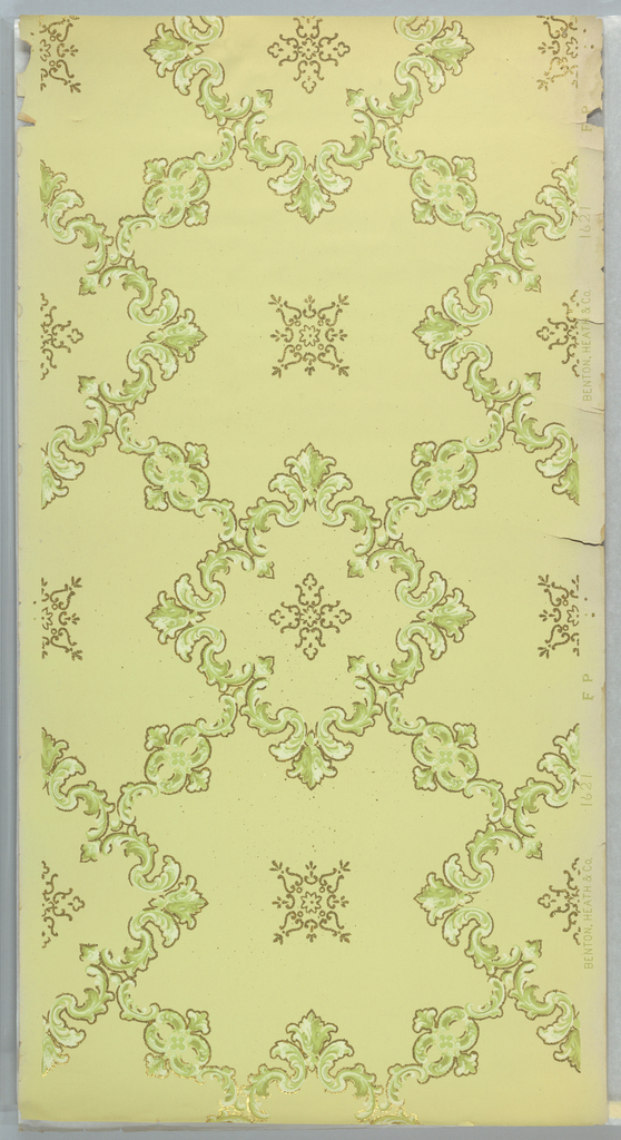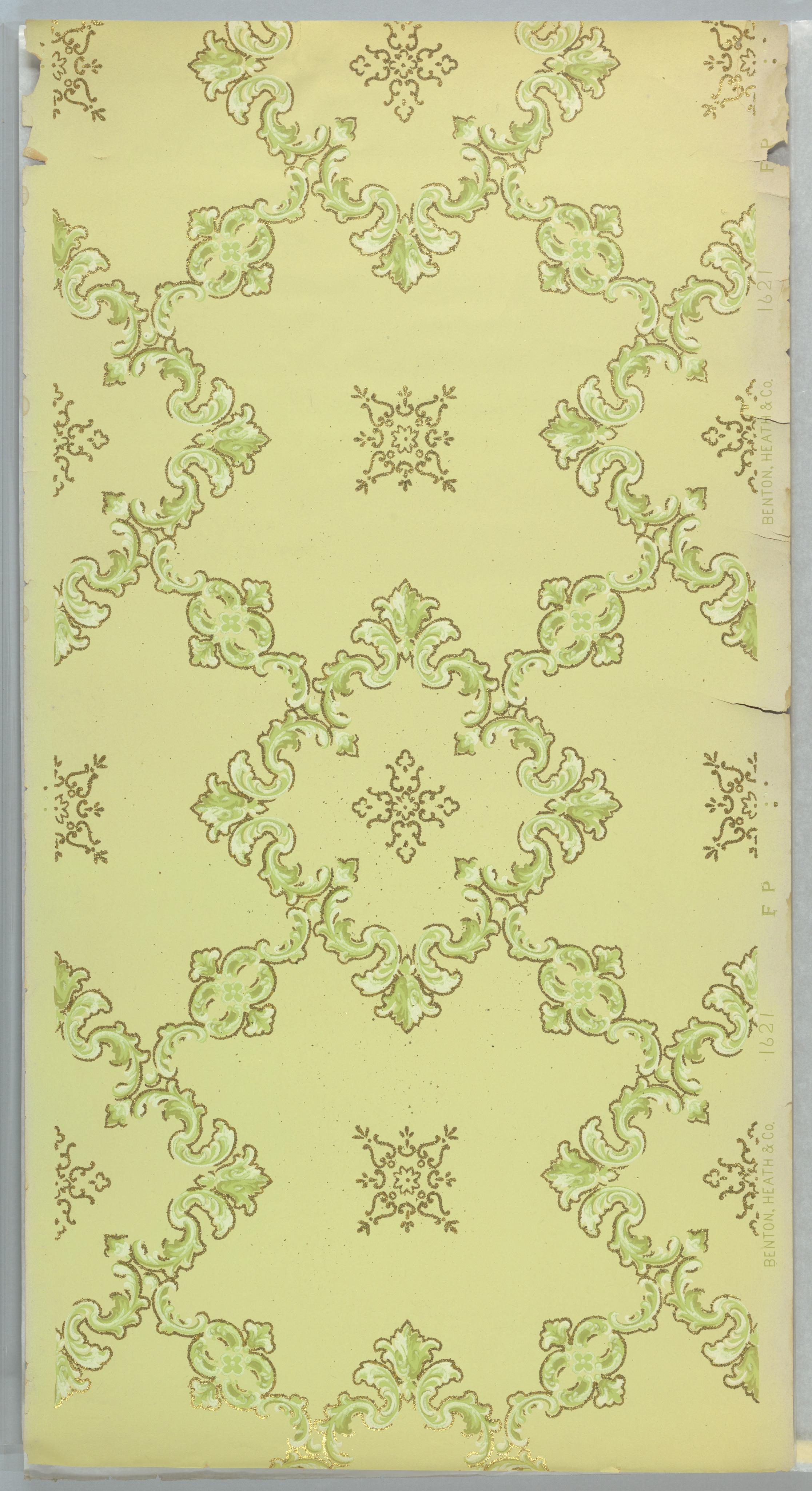 This is a Ceiling paper. It was manufactured by Benton, Heath & Co.. It is dated 1905–1915 and we acquired it in 1979. Its medium is machine-printed paper, applied mica flakes. It is a part of the Wallcoverings department.