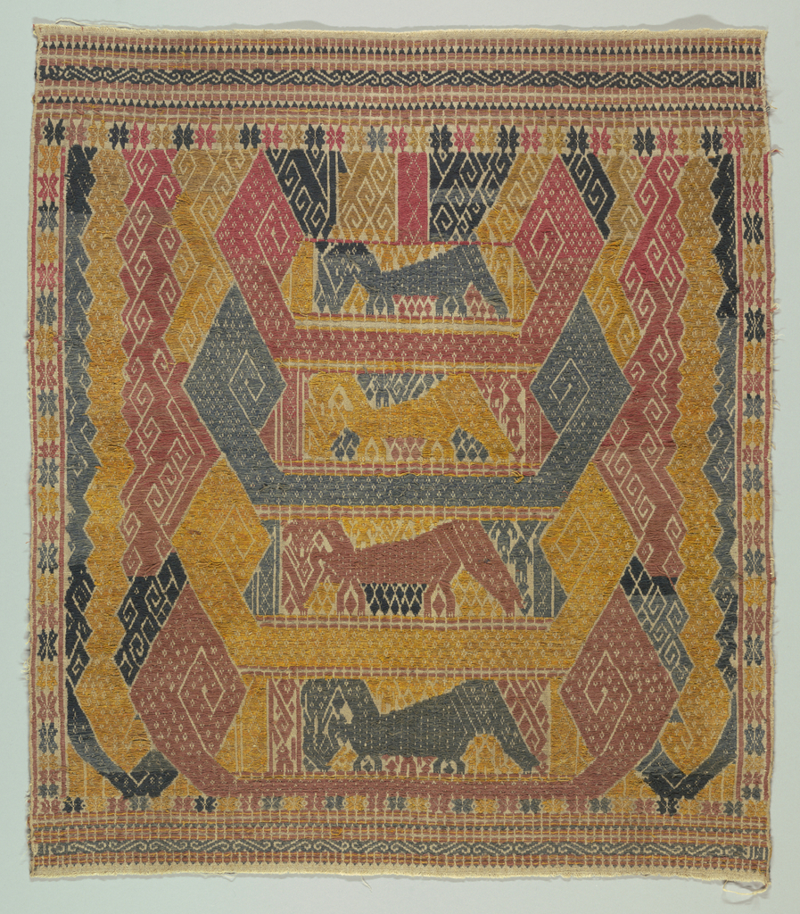 This is a Textile. It is dated late 19th–early 20th century and we acquired it in 1980. Its medium is cotton, silk and its technique is plain weave with continuous and discontinuous supplementary weft. It is a part of the Textiles department.