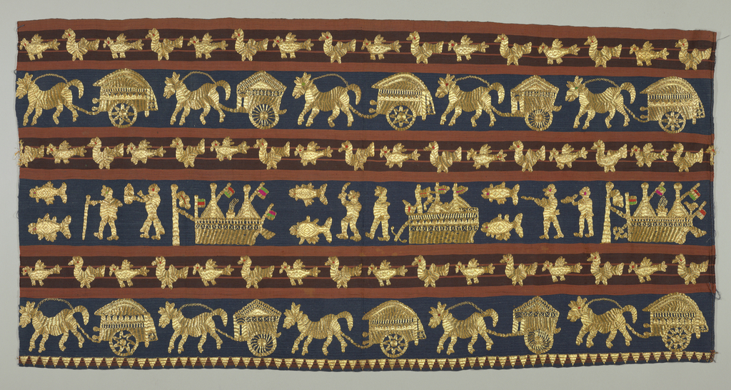 This is a Skirt panel. It is dated 1900–1980 and we acquired it in 1980. Its medium is cotton, silk, metallic threads and its technique is embroidered in couching stitches on plain weave. It is a part of the Textiles department.