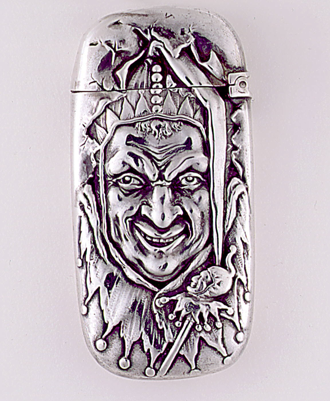 Jester Face Matchsafe; Manufactured by Gorham Manufacturing Company (United States); USA; silver; 6.5 x 3.2 x 1.3 cm (2 9/16 x 1 1/4 x 1/2 in. ); Gift of Stephen W. Brener and Carol B. Brener; 1980-14-360