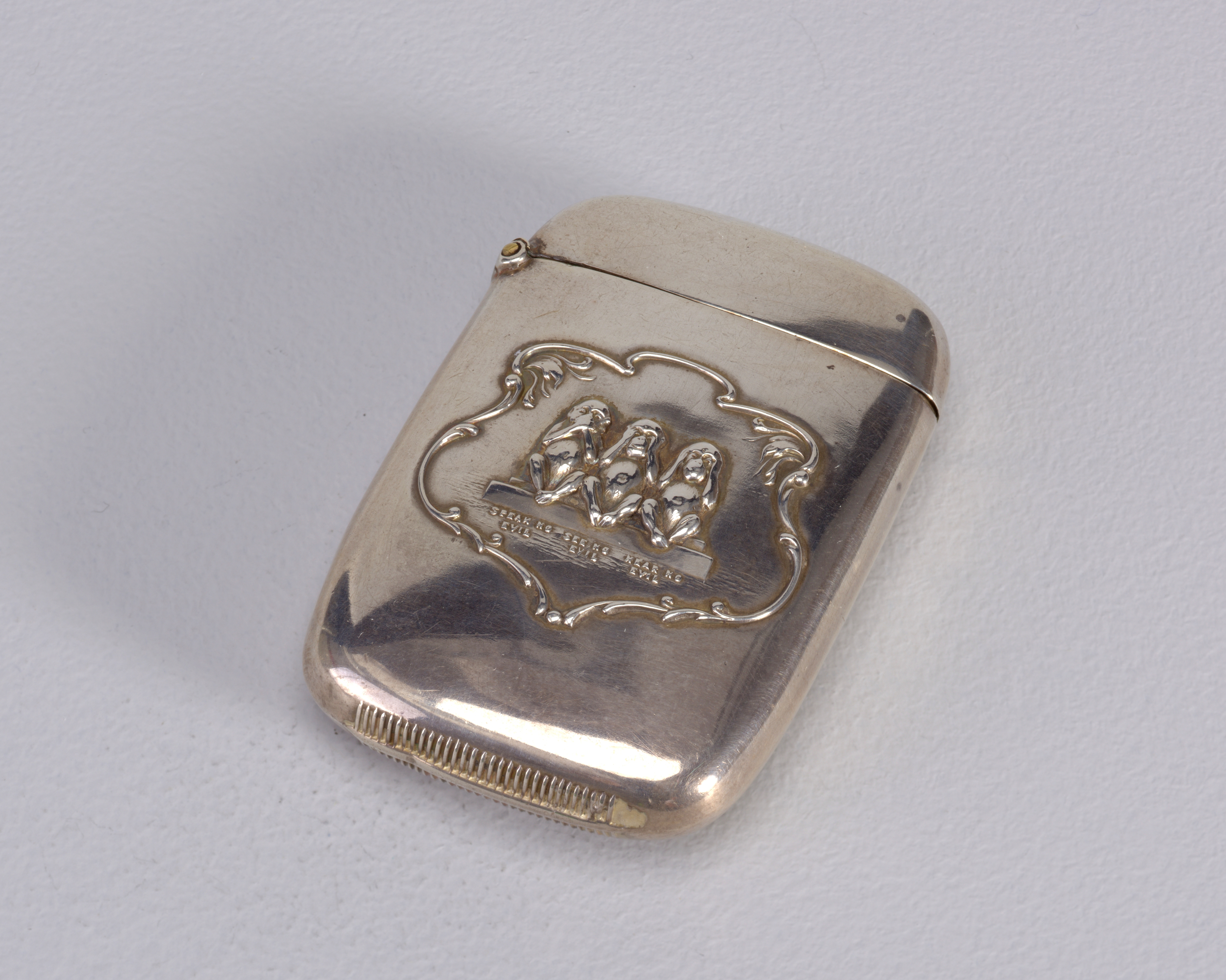 "Speak No Evil, See No Evil, Hear No Evil" Matchsafe; Possibly by Paye & Baker Manufacturing Company (United States); USA; silver; 6.3 x 4.2 x 1.1 cm (2 1/2 x 1 5/8 x 7/16 in. ); Gift of Stephen W. Brener and Carol B. Brener; 1980-14-84
