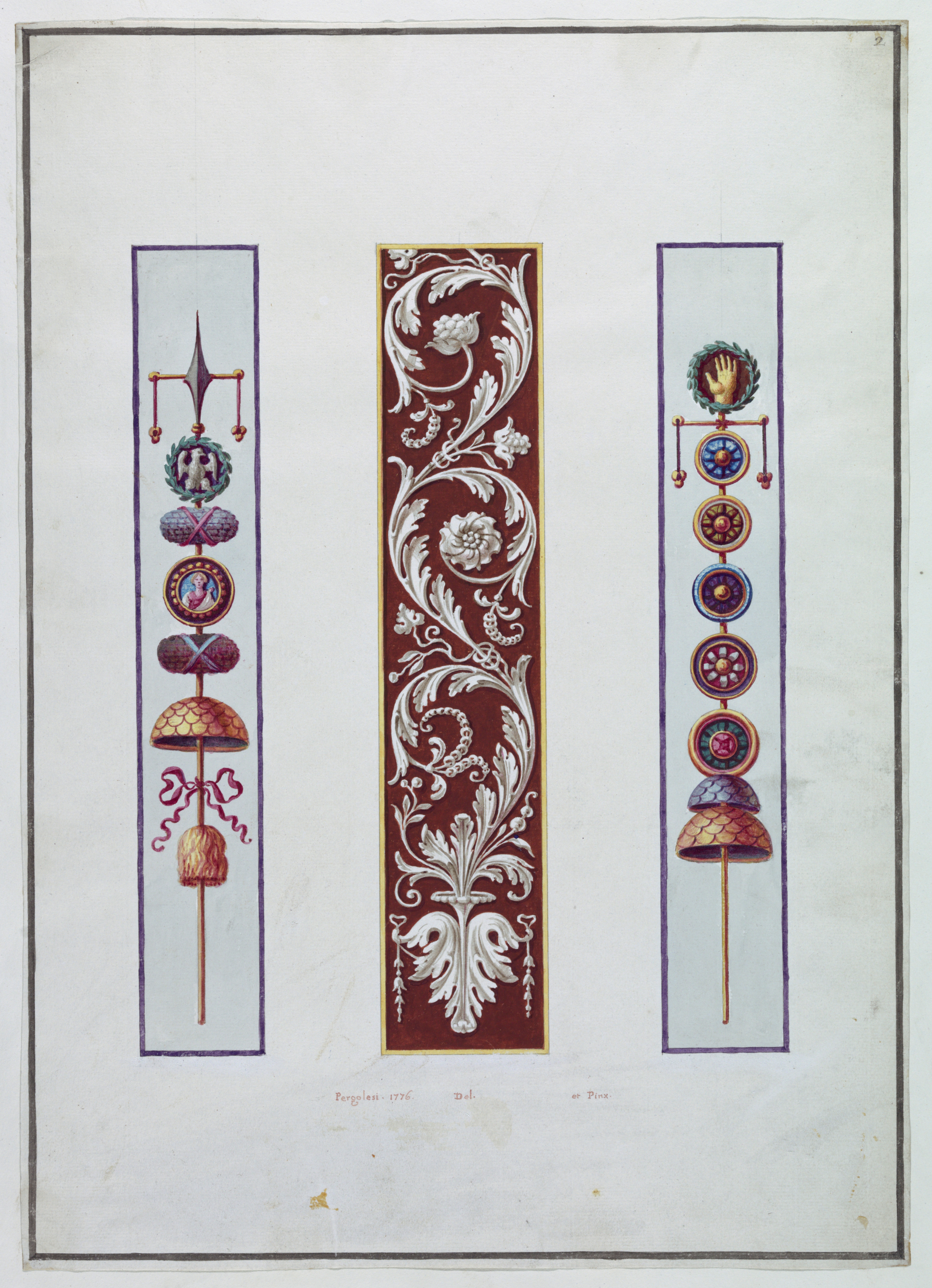 Drawing, Ornament Design, Arabesque Panel between Roman Standards; Michel Angelo Pergolesi (Italian, active ca. 1760–1801); pen and ink, brush and watercolor, gouache, over graphite on laid paper; Mount: 71.8 × 50.8 cm (28 1/4 in. × 20 in.) Sheet: 48.3 × 34.3 cm (19 in. × 13 1/2 in.) Center Design Motif: 31.5 × 3.9 cm (12 3/8 × 1 9/16 in.); Gift of Unknown Donor; 1980-32-1412