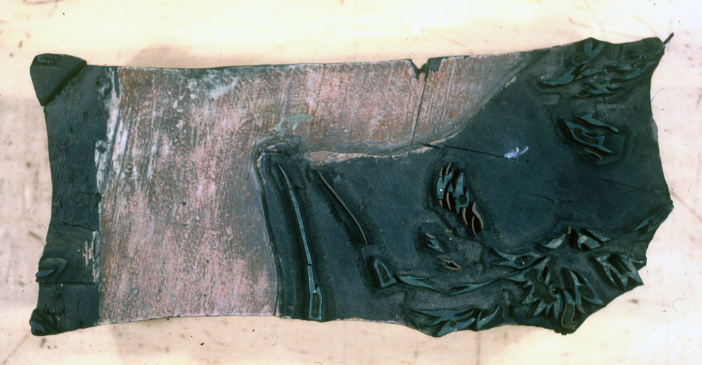 This is a Printing block. It is dated ca. 1925 and we acquired it in 1981. Its medium is wood, copper, felt. It is a part of the Textiles department.