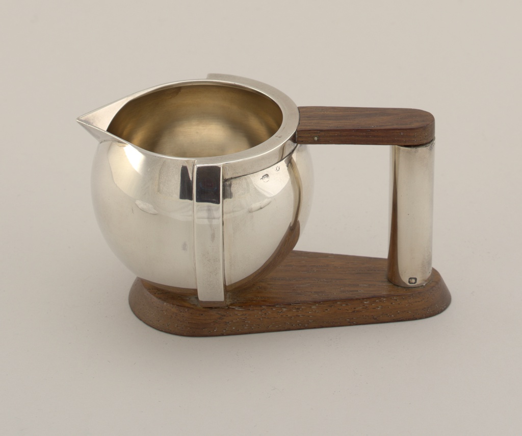 This is a creamer. It was designed by Jean Elysée Puiforcat. It is dated ca. 1928 and we acquired it in 1982. Its medium is silver, walnut. It is a part of the Product Design and Decorative Arts department.
