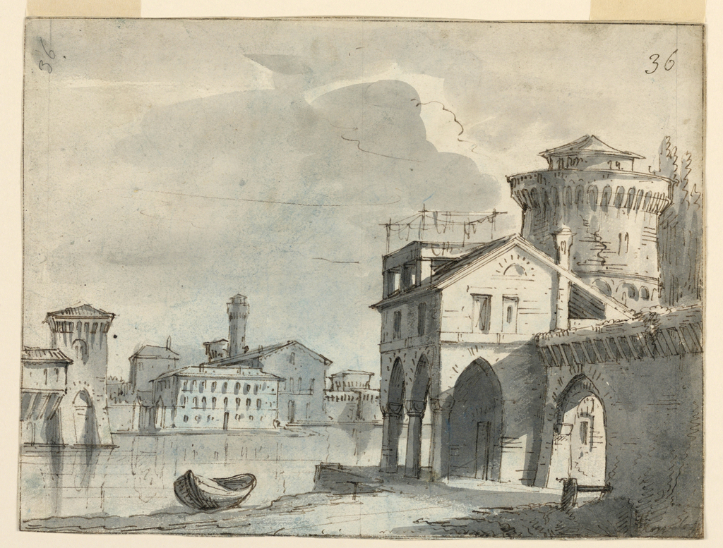 Drawing, Stage Design, Buildings on Riverside; After Alessandro Sanquirico (Italian, 1777 - 1849); Italy; pen and sepia ink, brush and wash on paper; H x W: 20.8 × 27.2 cm (8 3/16 × 10 11/16 in.); Museum purchase through gift of various donors and from Eleanor G. Hewitt Fund; 1938-88-297