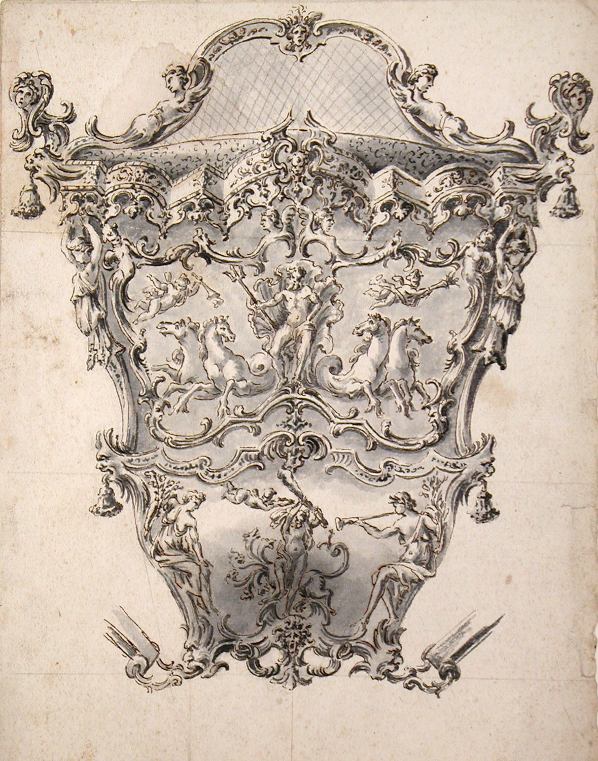 Drawing, Design for a back panel of a coach; Unknown; Italy; brush and gray watercolor, pen and ink, black chalk on paper; 30.9 x 23.8 cm (12 3/16 x 9 3/8 in.); Museum purchase through gift of various donors and from Eleanor G. Hewitt Fund; 1938-88-3251