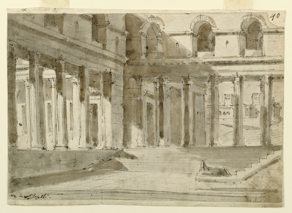 Drawing, Stage Design, Palace Court with Stairs; Italy; pen and brown ink, brush and gray and brown wash on laid paper, laid down; verso: black chalk; H x W: 18.8 × 27 cm (7 3/8 × 10 5/8 in.); Museum purchase through gift of various donors and from Eleanor G. Hewitt Fund; 1938-88-349