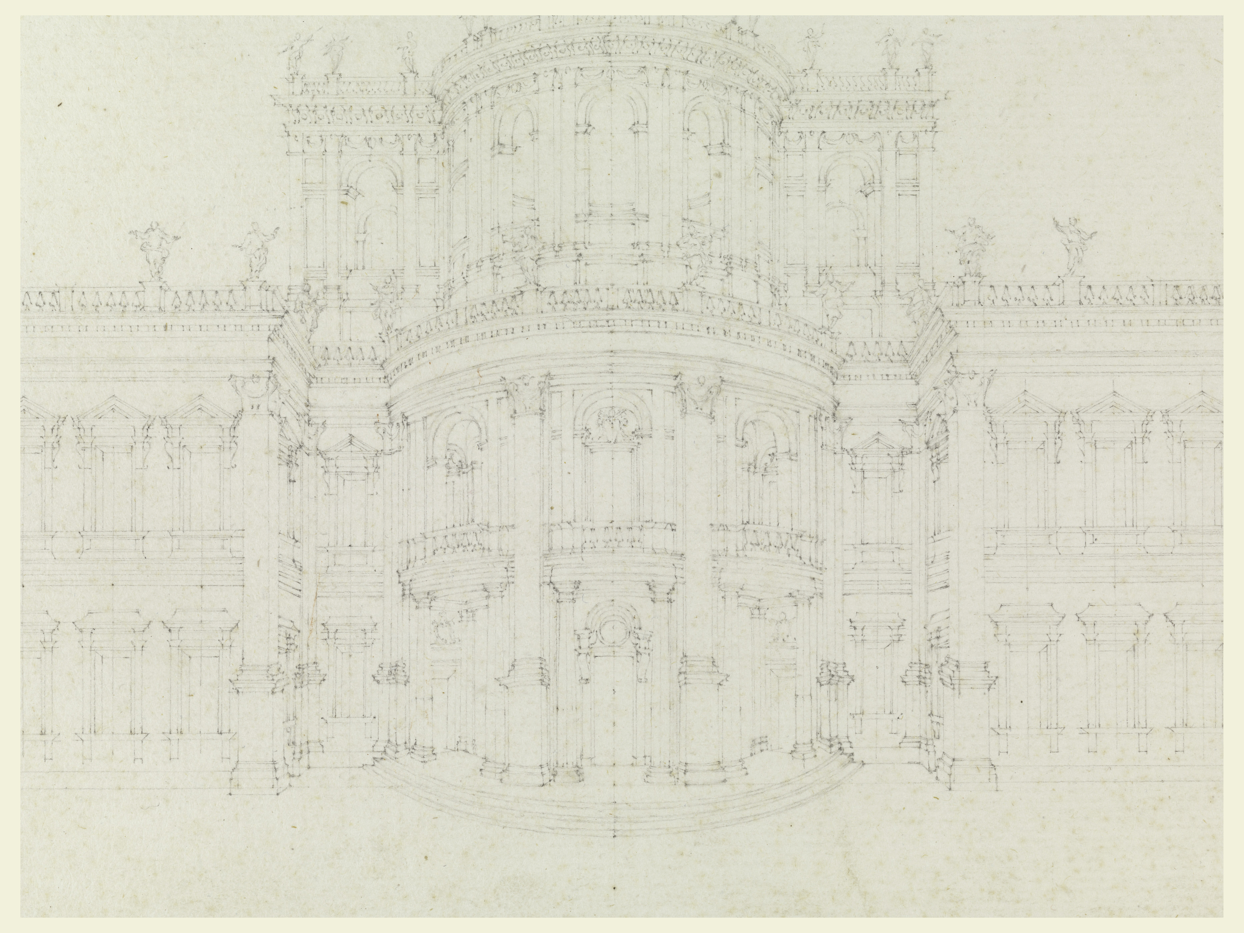 This is a Drawing. It was attributed to Johann Fischer von Erlach and attributions: Mattia de Rossi and Domenico Martinelli. It is dated 1670–80 and we acquired it in 1938. Its medium is graphite (leadpoint) . It is a part of the Drawings, Prints, and Graphic Design department.