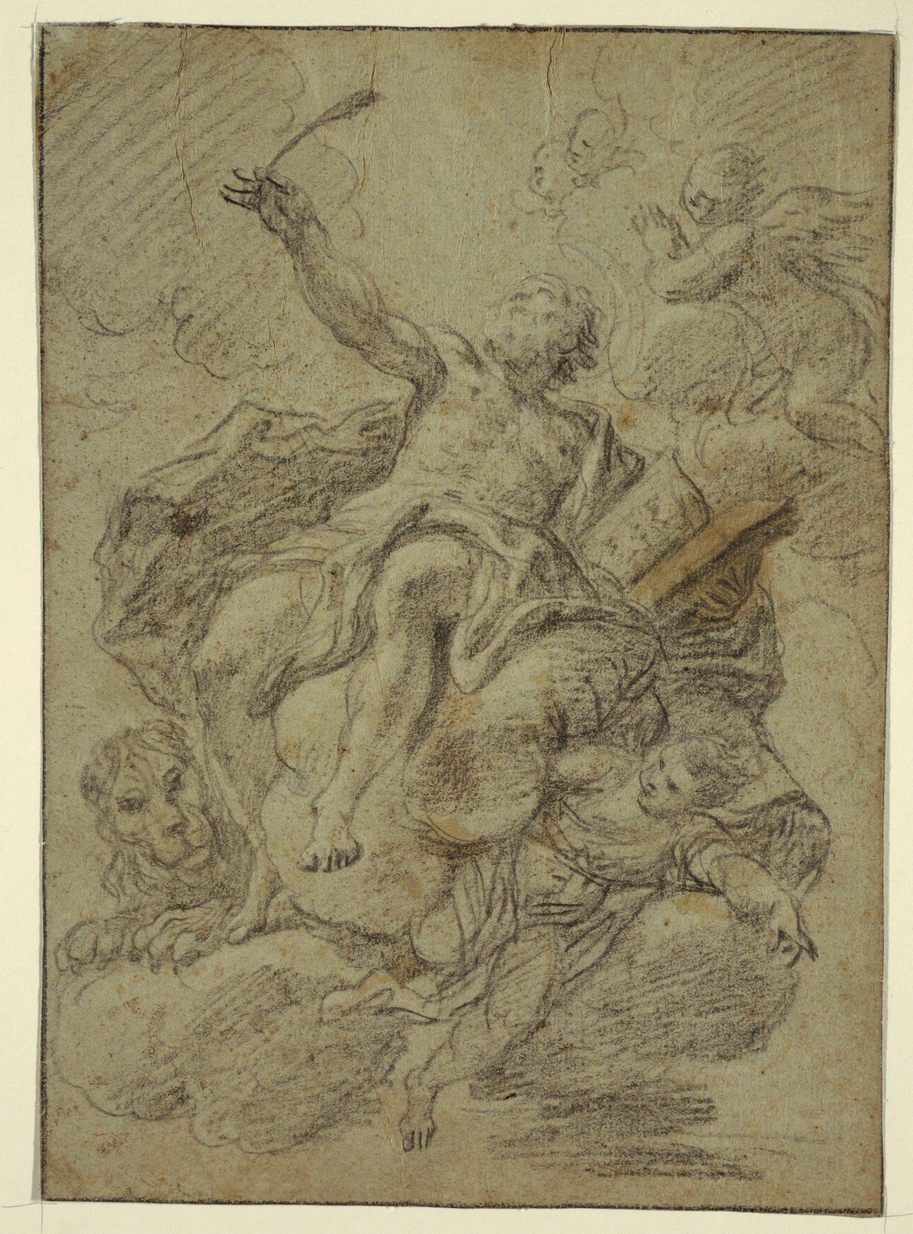 Drawing, St. Mark; Paolo de Mattheis (Italian, 1662 - 1728); Italy; black and white chalk on green paper; 27 x 19.4 cm (10 5/8 x 7 5/8 in.); Museum purchase through gift of various donors and from Eleanor G. Hewitt Fund; 1938-88-6439