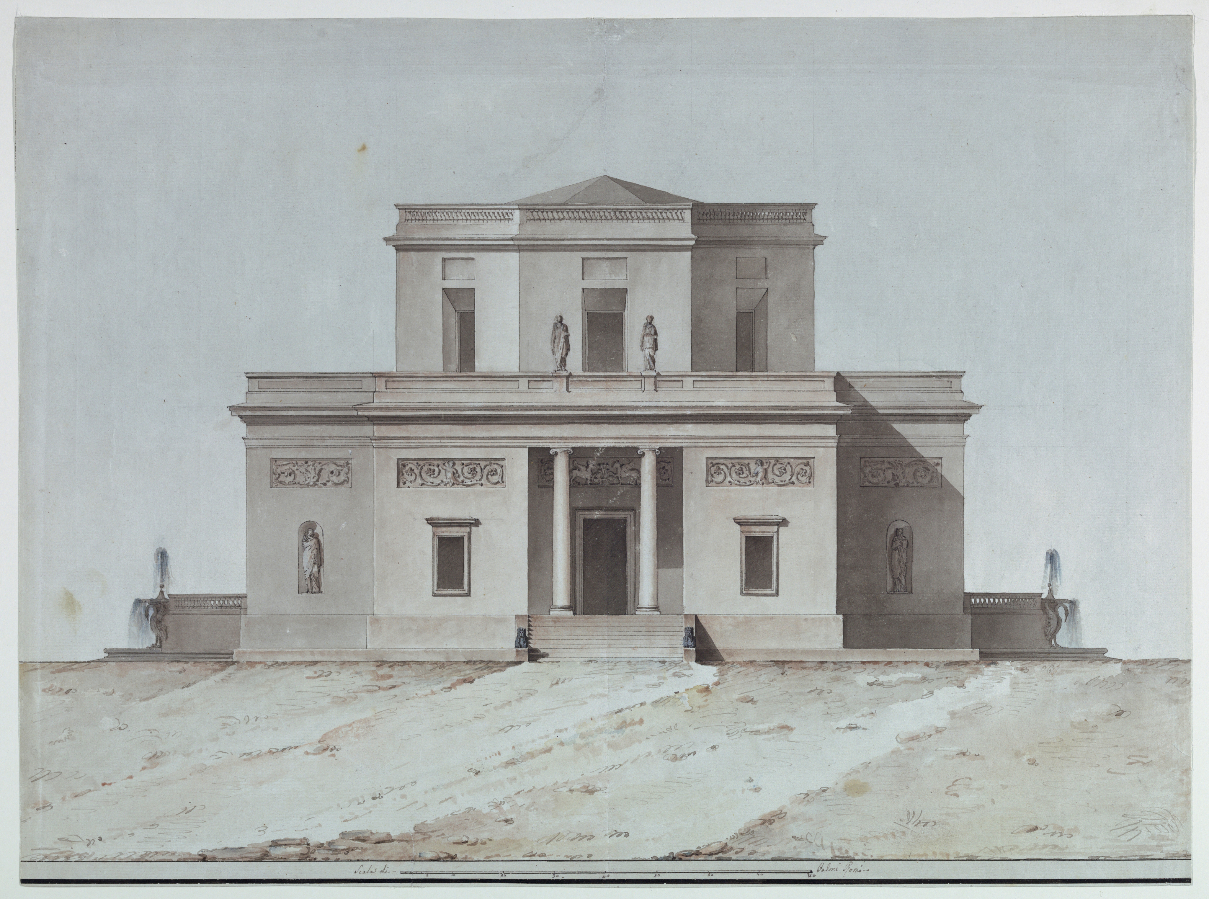 Drawing, Elevation of a Country Villa; Architect: Unknown (Italian); Italy; pen and black ink, brush and rose, brown and blue watercolor, black wash, with black chalk indications on paper; 38 x 51.3 cm (14 15/16 x 20 3/16 in.); Museum purchase through gift of various donors and from Eleanor G. Hewitt Fund; 1938-88-7167