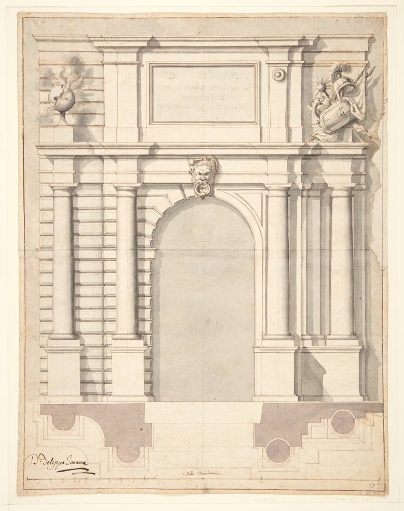 Signed in lower left corner, "D. Filippo Juvarra" The number 62 is inscribed in chalk on the ressaut to the left of the plaque