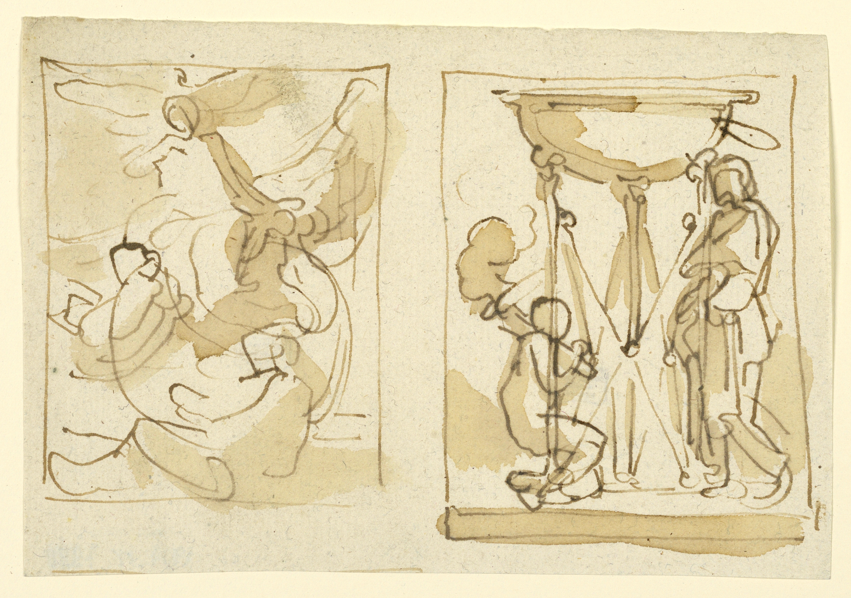 Drawing, Two Studies; Fortunato Duranti (Italian, 1787 - 1863); Italy; pen and bistre ink, brush and wash on paper; 19.5 × 13.2 cm (7 11/16 × 5 3/16 in.); Museum purchase through gift of various donors and from Eleanor G. Hewitt Fund; 1938-88-7378