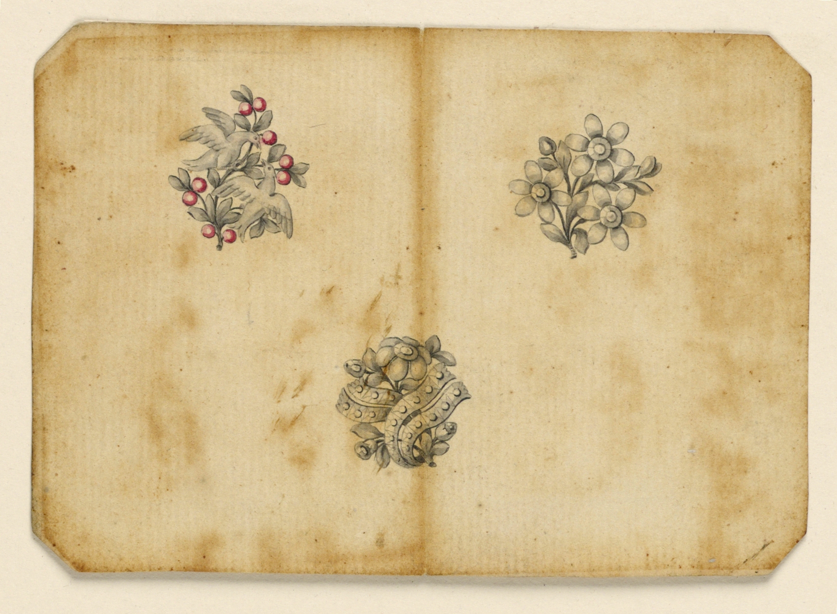 Drawing, Designs for Three Brooches; Designed by Giovanni Sebastiano Meyandi (Italian, active 1762 - 1794); Italy; pen and ink, brush and gray, red watercolor on paper; 9.4 × 13.3 cm (3 11/16 × 5 1/4 in.); Museum purchase through gift of various donors and from Eleanor G. Hewitt Fund; 1938-88-875