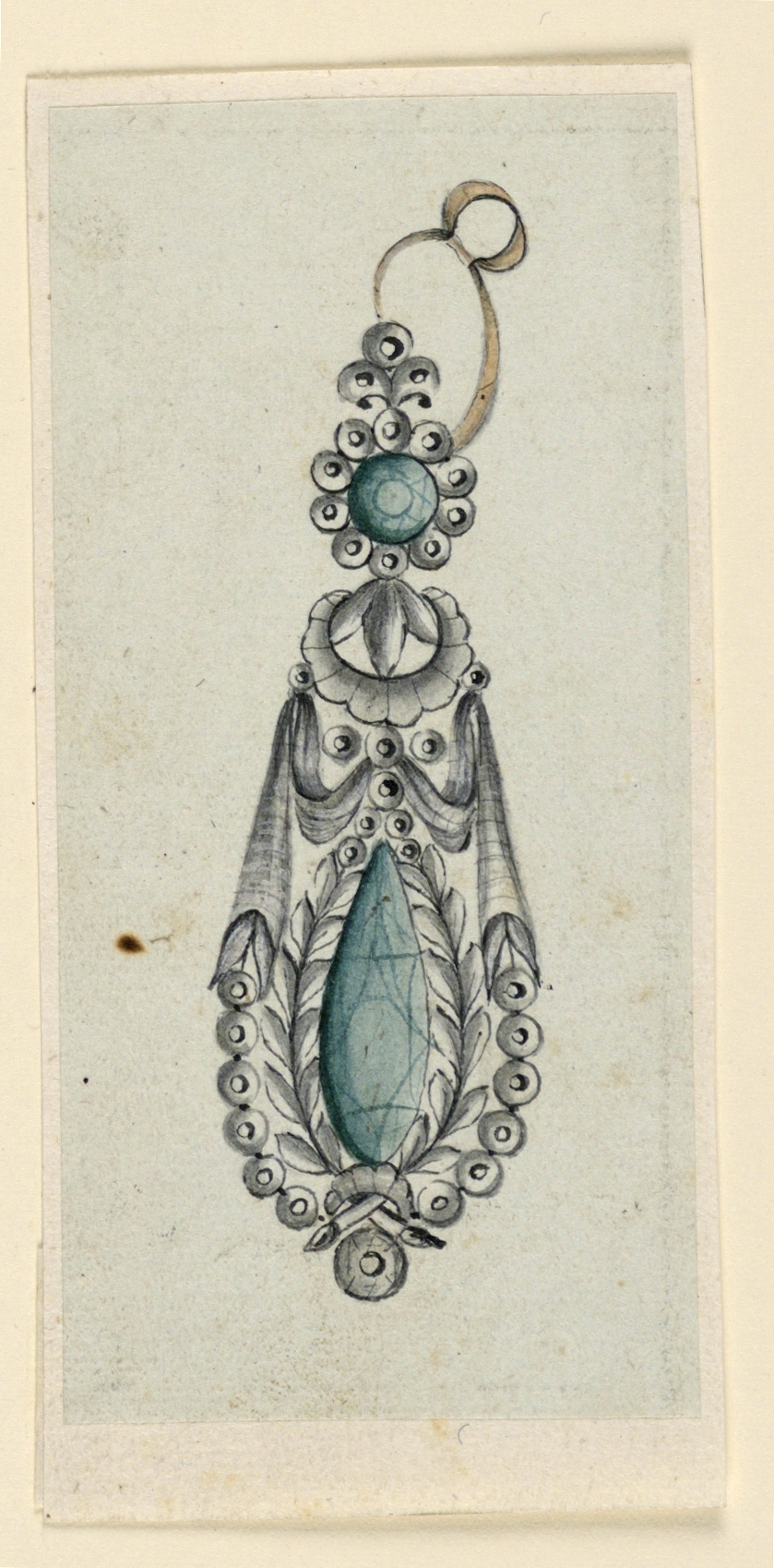 Drawing, Design for an Earring; Italy; pen and black ink, brush and gray, green, yellow watercolor on light green paper; 12 × 5.8 cm (4 3/4 × 2 5/16 in.); Museum purchase through gift of various donors and from Eleanor G. Hewitt Fund; 1938-88-901