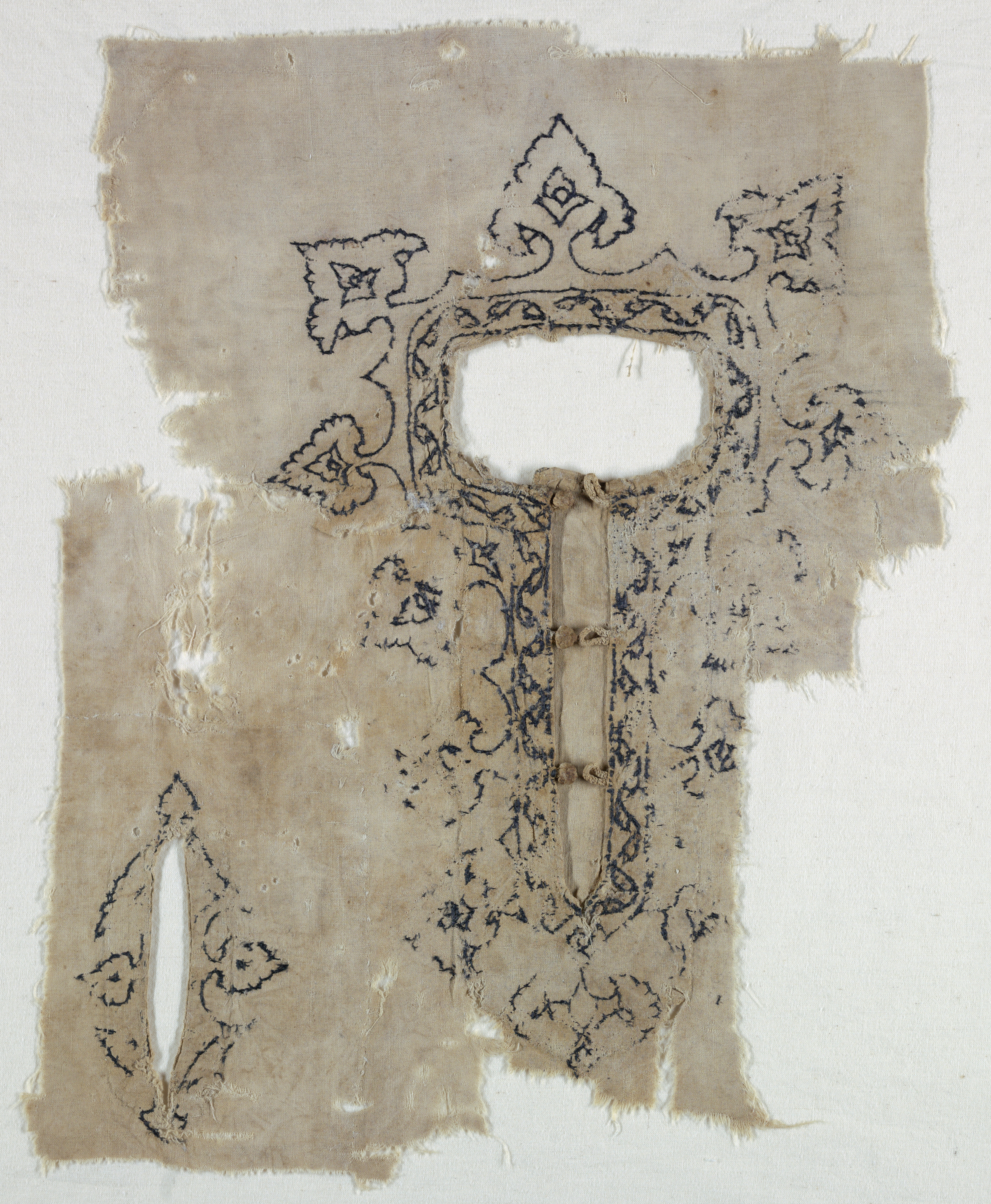 This is a Fragment of a child's tunic. It is dated 10th–12th century and we acquired it in 1939. Its medium is linen, silk and its technique is plain weave; split and outline stitches. It is a part of the Textiles department.