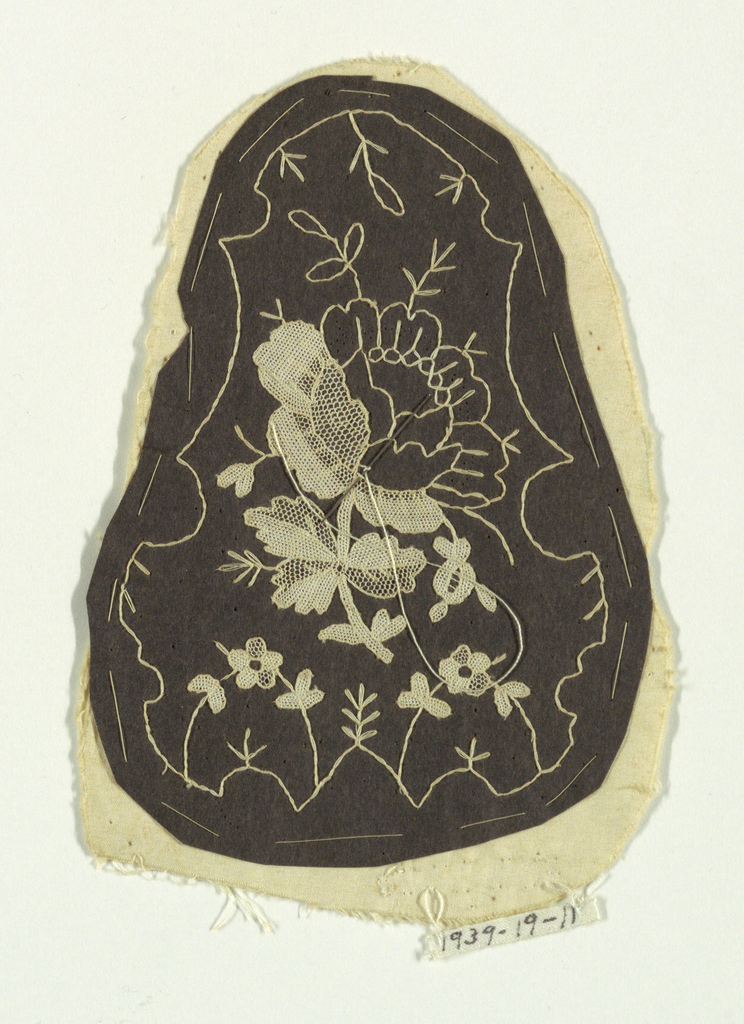 This is a Pattern with uncompleted lace. It is dated late 19th century and we acquired it in 1939. Its medium is paper, wool, linen and its technique is needle lace with ground of loop & twist with loop & twist return. It is a part of the Textiles department.