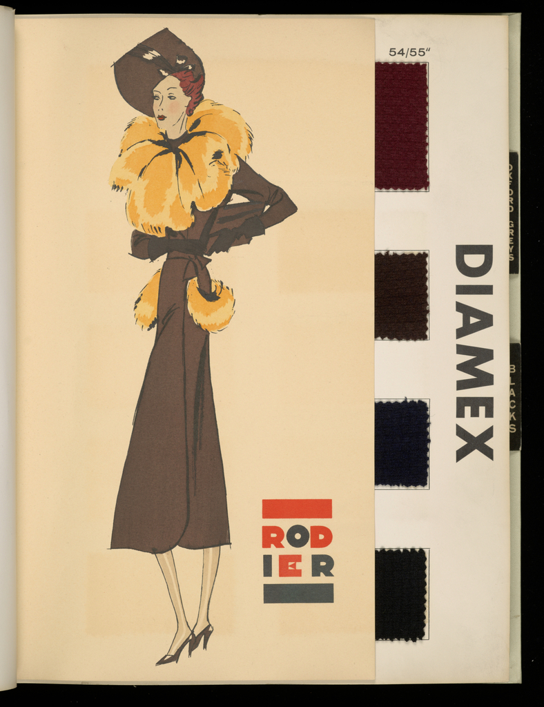 This is a Sample book. It was manufactured by Rodier. It is dated 1938 and we acquired it in 1939. Its medium is cardboard binding, celluloid, wool, silk, metallic. It is a part of the Textiles department.
