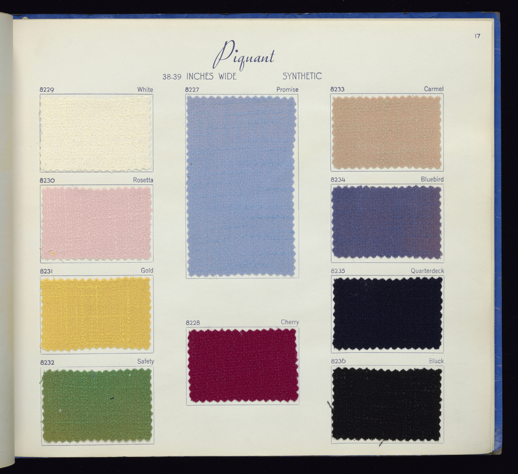 This is a Manufacturer's sample book. It is dated 1939 and we acquired it in 1939. Its medium is silk, rayon, linen, paper and its technique is printed. It is a part of the Textiles department.
